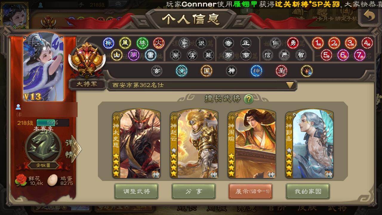 官阶:大将军;VIP等级:VIP13;史诗武将数量:79;动态皮肤数量:58
