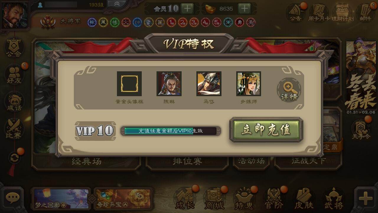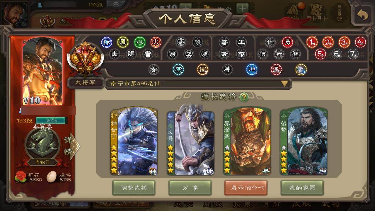官阶:大将军;VIP等级:VIP10;史诗武将数量:36;动态皮肤数量:35