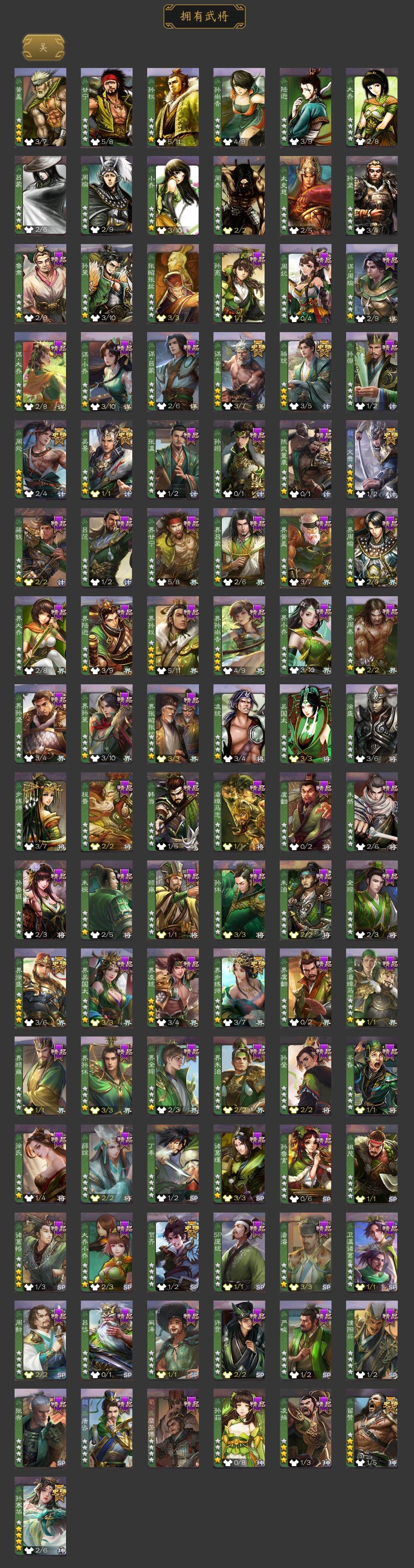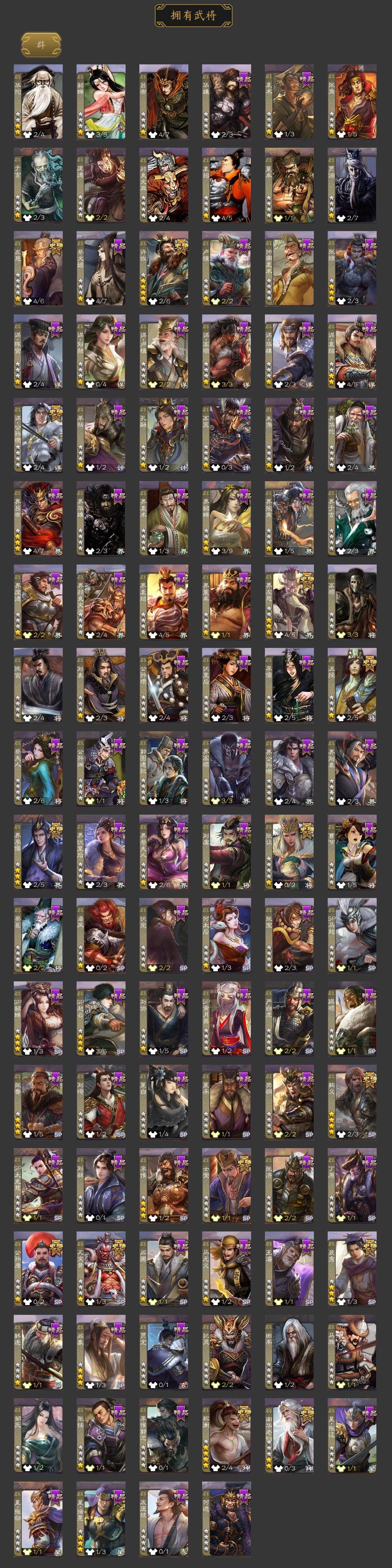 神赵云,神陆逊,神甘宁,神张辽,神郭嘉,神太史慈,神孙策,神关羽,神吕蒙,神周瑜,星周不疑,王粲,杨修,文鸯,界钟会,界于禁,嵇康,郝昭,陈琳,曹婴,曹纯,戏志才,关索,马云騄,谋赵云,谋马超,诸葛瞻,周群,赵襄,沙摩柯,界黄忠,花鬘,董允,谋关羽,谋黄盖,周处,吴景,孙寒华,
