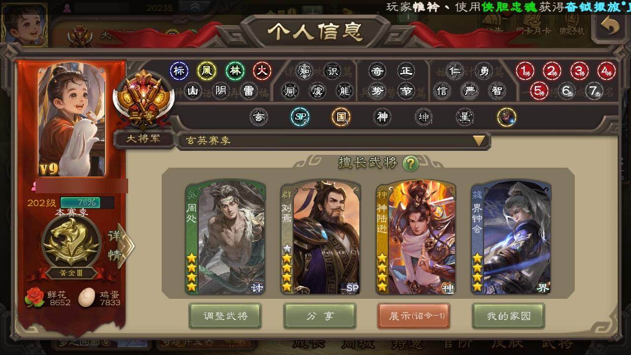 官阶:大将军;VIP等级:VIP9;史诗武将数量:46;动态皮肤数量:36;