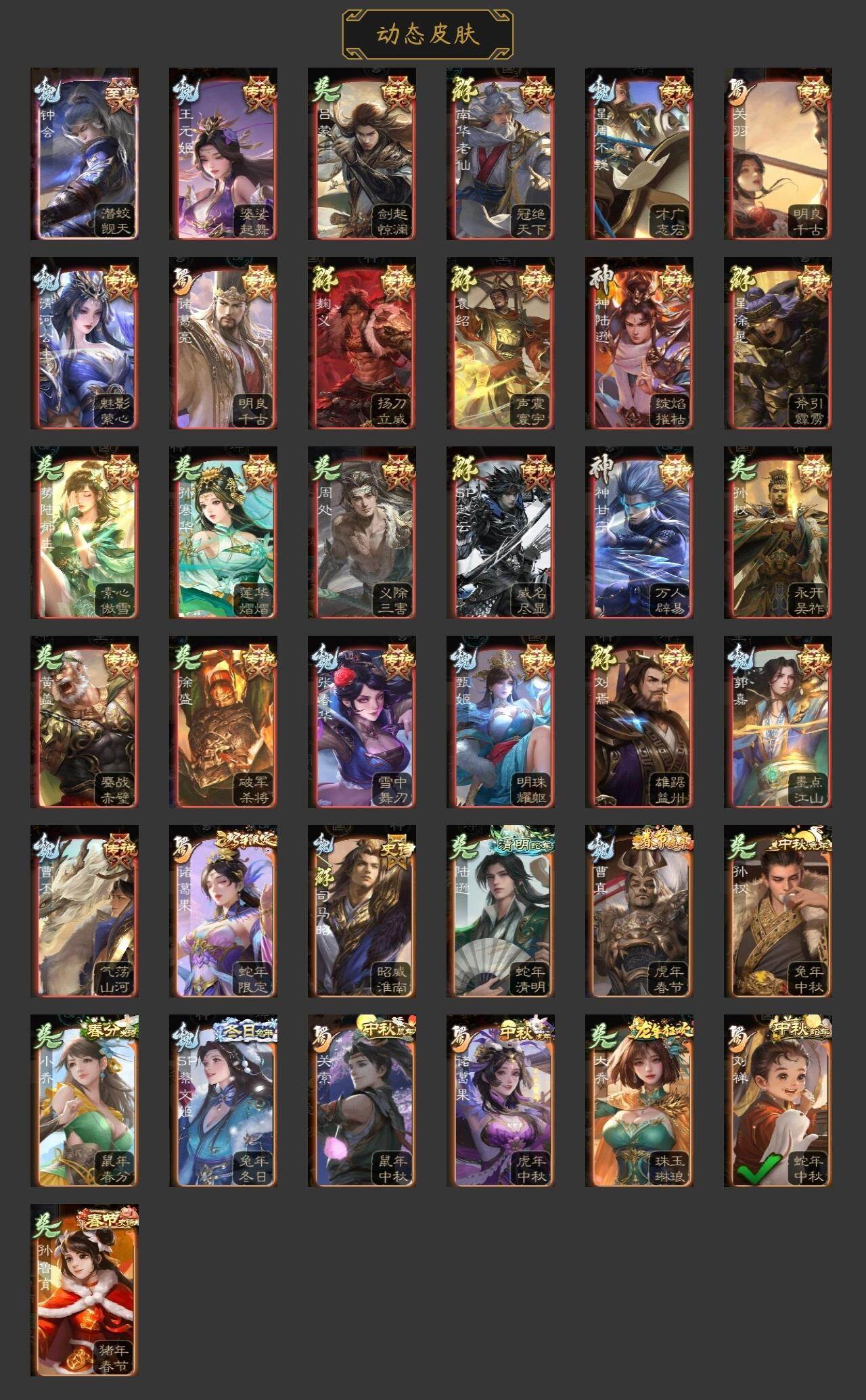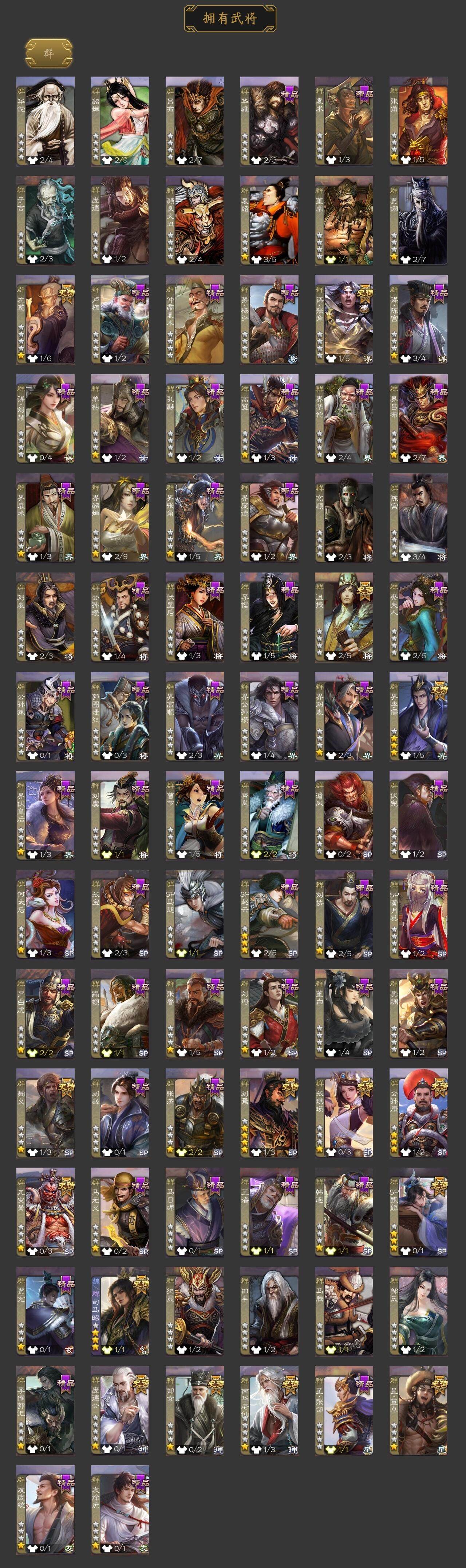 神吕布,神陆逊,神甘宁,神张辽,神吕蒙,神周瑜,曹髦,星周不疑,王粲,谋曹操,王元姬,魏-司马昭,界钟会,陈琳,曹纯,戏志才,清河公主,关索,谋赵云,诸葛瞻,周群,赵襄,沙摩柯,谯周,界黄忠,花鬘,董允,谋关羽,周处,吴景,界朱然,界徐盛,势陆郁生,谋郭嘉,左慈,郑玄,张琪瑛,麹义,庞
