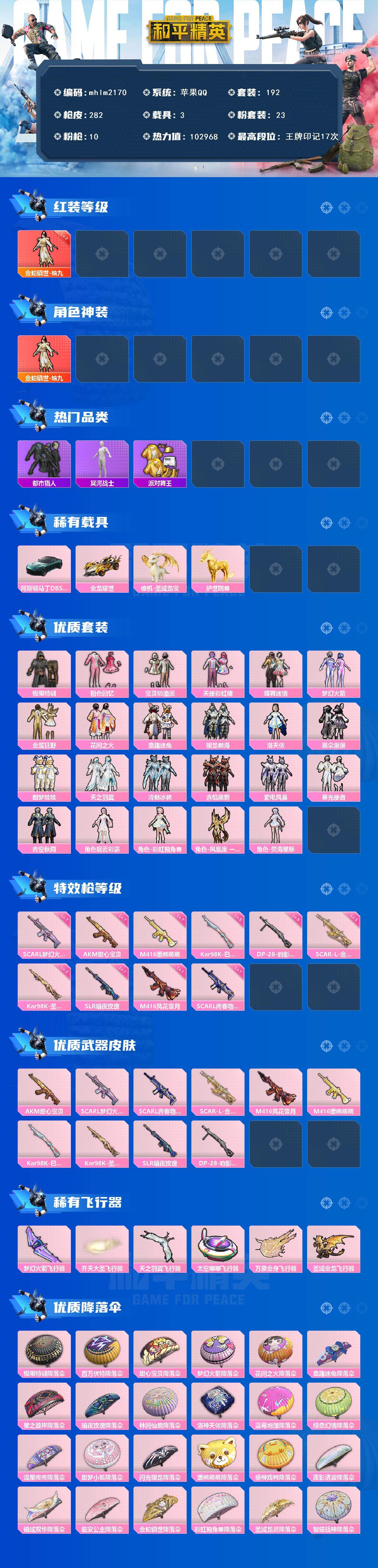 苹果 手Q-1神装-23粉装-10特效枪-3载具-6粉色飞行器-102968热力值-17王牌印记-192套装-282枪皮