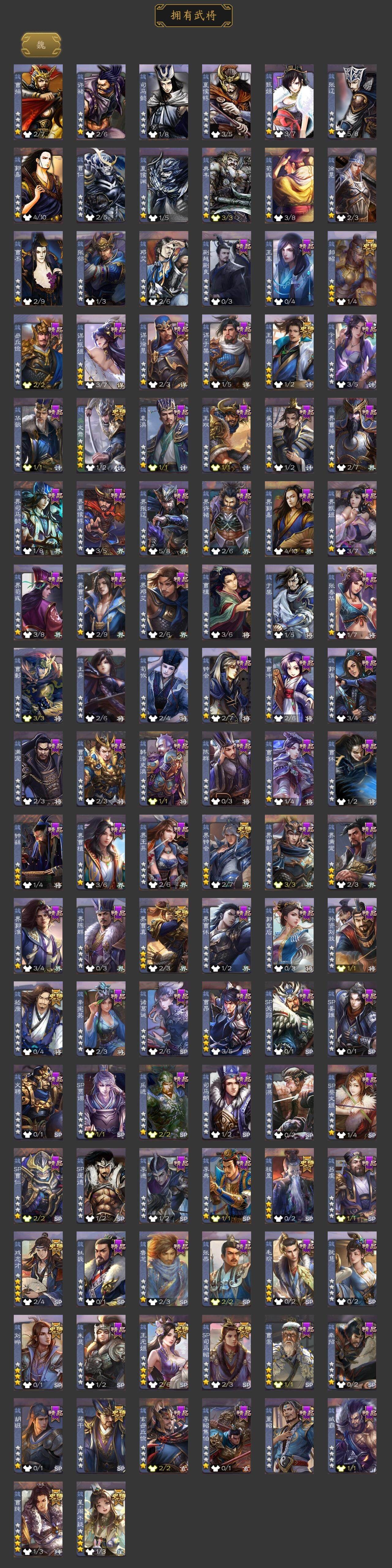 神曹操,神吕布,神赵云,神陆逊,神甘宁,神张辽,神太史慈,神孙策,神吕蒙,神周瑜,SP司马昭,星周不疑,王粲,文鸯,王元姬,界钟会,界曹真,嵇康,郝昭,曹纯,戏志才,刘晔,蒋干,关索,马云騄,谋赵云,谋马超,诸葛瞻,赵襄,谯周,花鬘,董允,骆统,界朱然,界徐盛,谋黄月英,裴秀,左