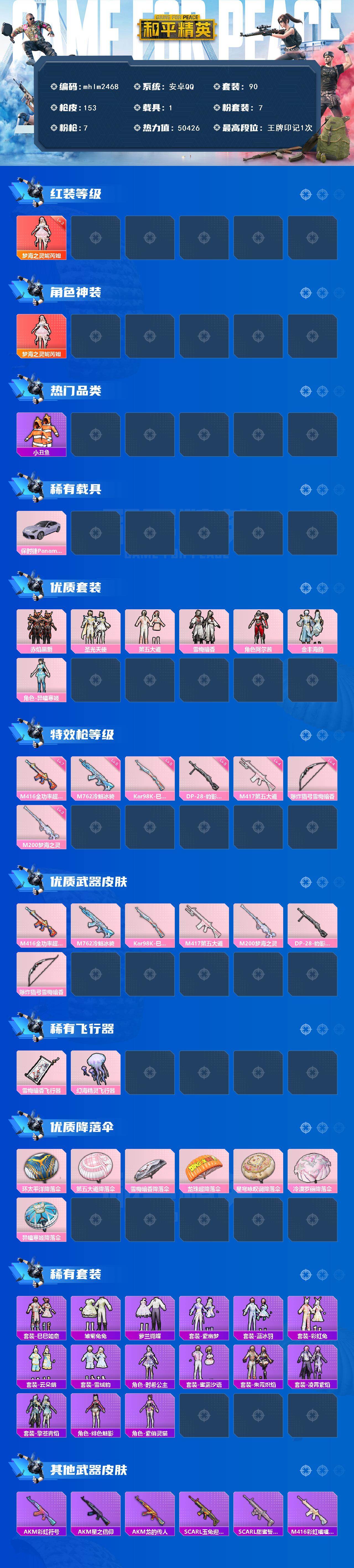 安卓 手Q-1神装-7粉装-7特效枪-1载具-3粉色飞行器-50426热力值-1王牌印记-90套装-153枪皮