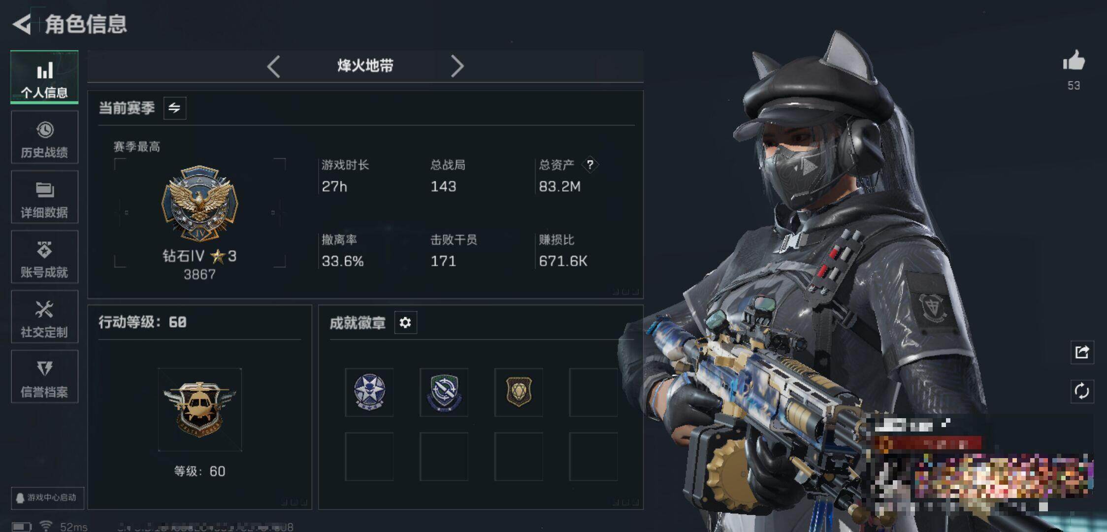 总资产:83.2M,哈夫币:72W,武器皮肤169,烽火60级:钻石,通行证5