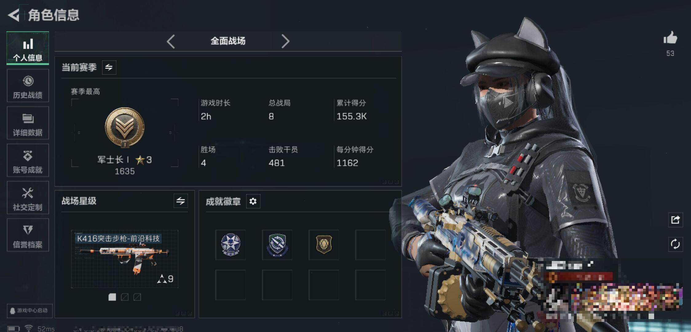 总资产:83.2M,哈夫币:72W,武器皮肤169,烽火60级:钻石,通行证53级:通行证免费版 【安全箱】进阶安全箱;【特勤处等级】仓库LV.8,指挥中心LV.4,训练中心LV.6,靶场LV.4,潜水中心LV.1,收藏室LV.0;【干员皮肤3】:红狼蚀金玫瑰,露娜黑天际线,红狼电锯惊魂;【已有捆绑包6】:蚀金玫瑰捆绑包,狩猎时刻捆绑包,黑天际线捆绑包,鹅鸭杀捆绑包,电锯惊魂干员捆绑包,曙光捆绑包;【近战皮肤】:近战武器-黑鹰;【步枪皮肤】:KC17突击步枪-电锯惊魂,M4A1突击步枪-蚀金玫瑰