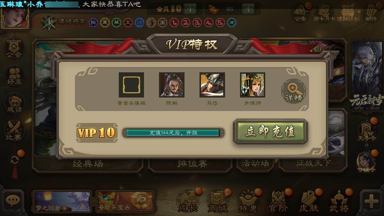 官阶:骠骑将军;VIP等级:VIP10;史诗武将数量:34;动态皮肤数量:2