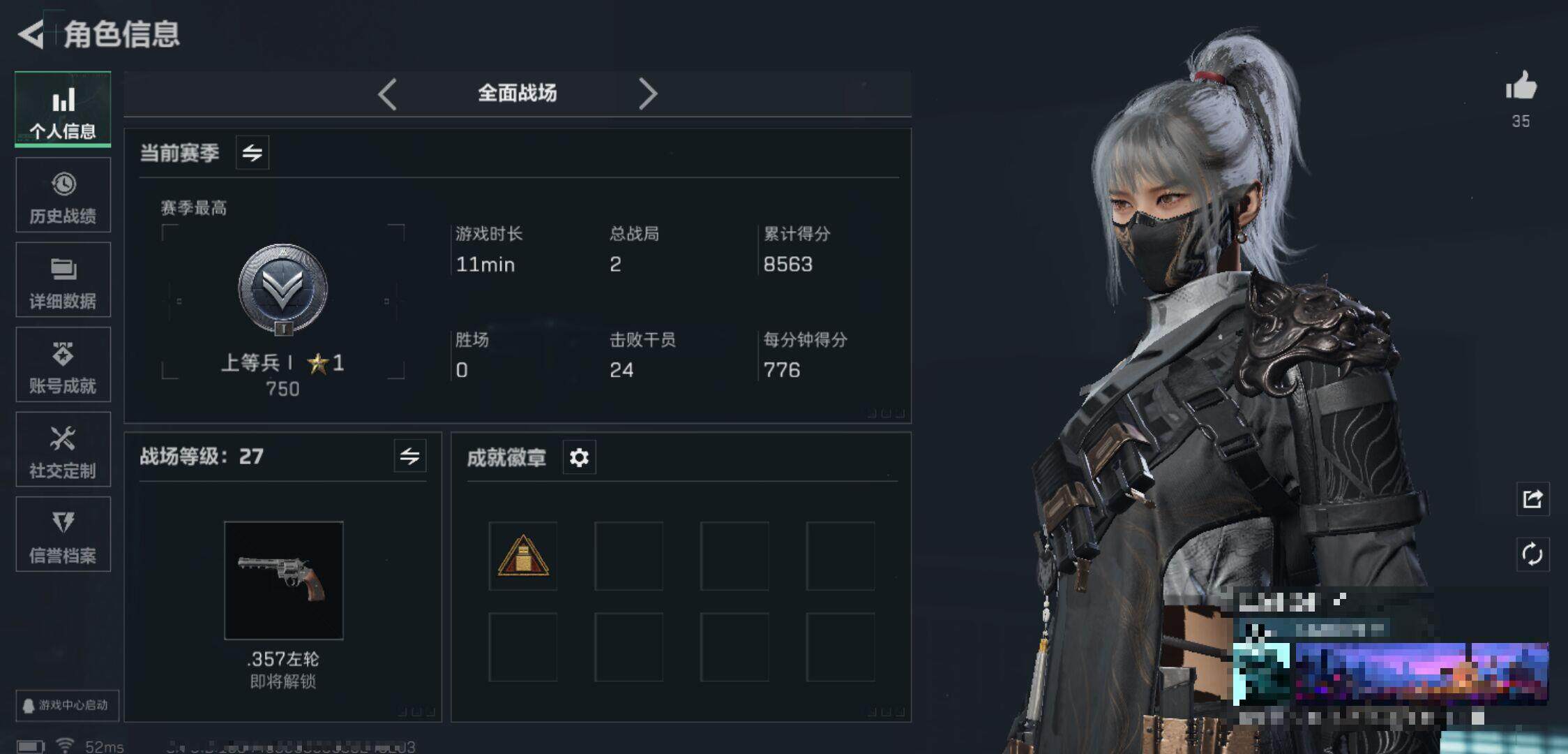 总资产:166M,哈夫币:420W,武器皮肤104,烽火60级:黑鹰,战场27