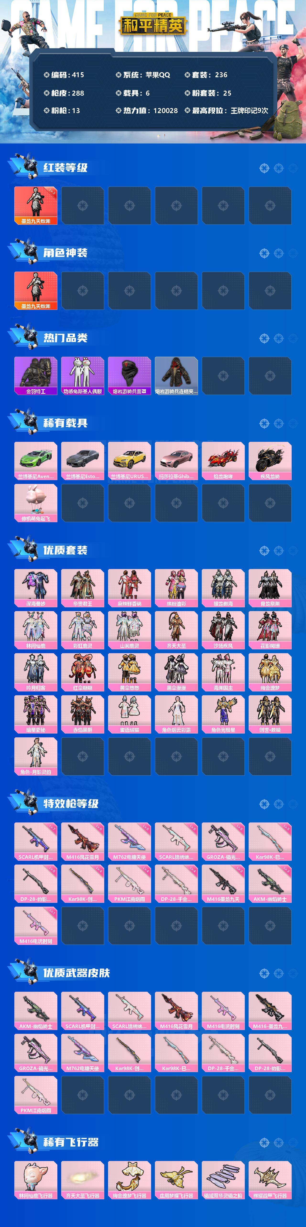 【商品标题】:苹果 手Q-1神装-25粉装-13特效枪-6载具-11粉色飞行器-120028热力值-9王牌印记-236套装-288枪皮