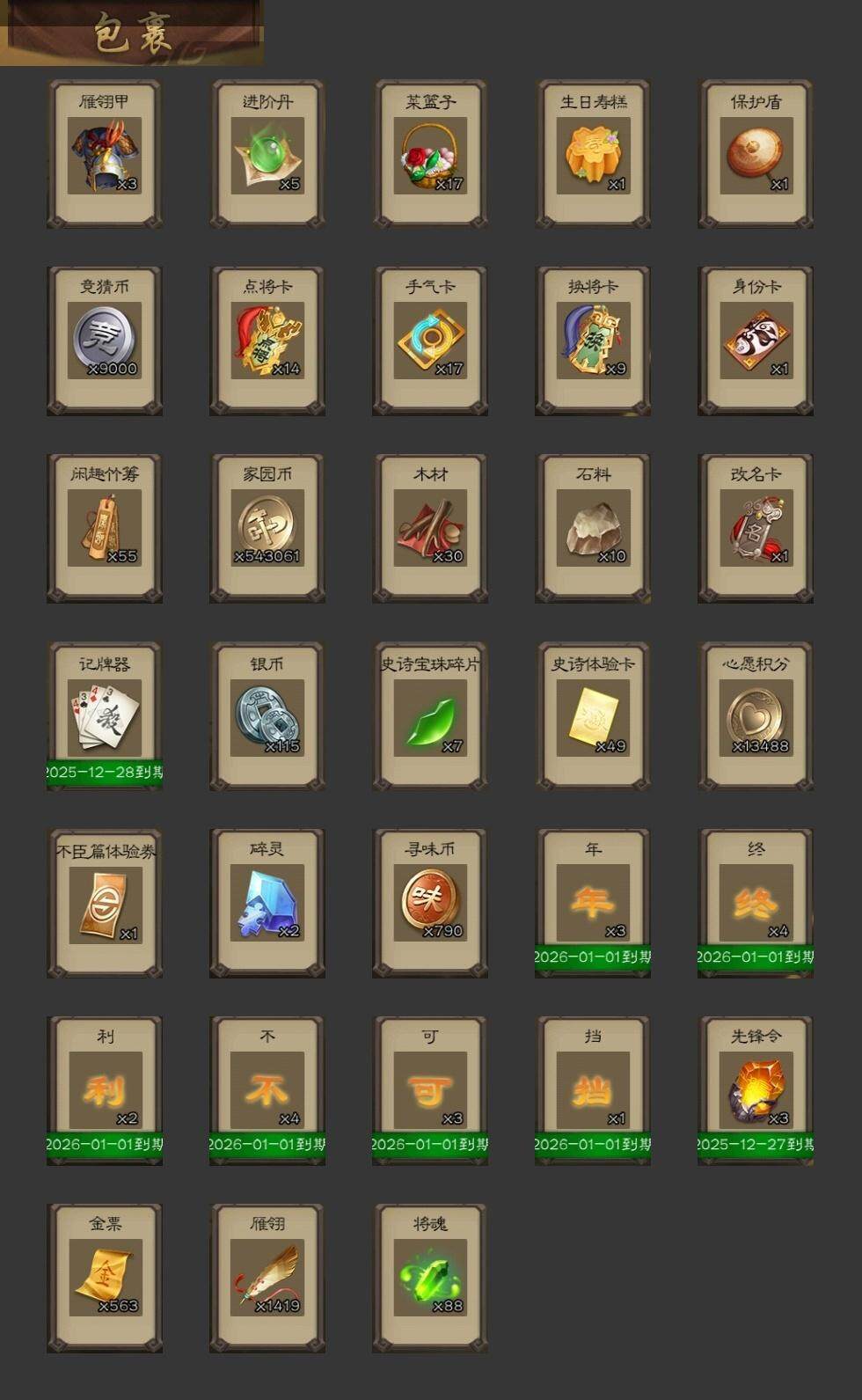 官阶:大将军;VIP等级:VIP13;史诗武将数量:57;动态皮肤数量:34;武将总数:422;史诗宝珠数量:0;将魂数量:88;神将:9;魏国史诗武将:31;蜀国史诗武将:9;吴国史诗武将:9;群史诗武将:19