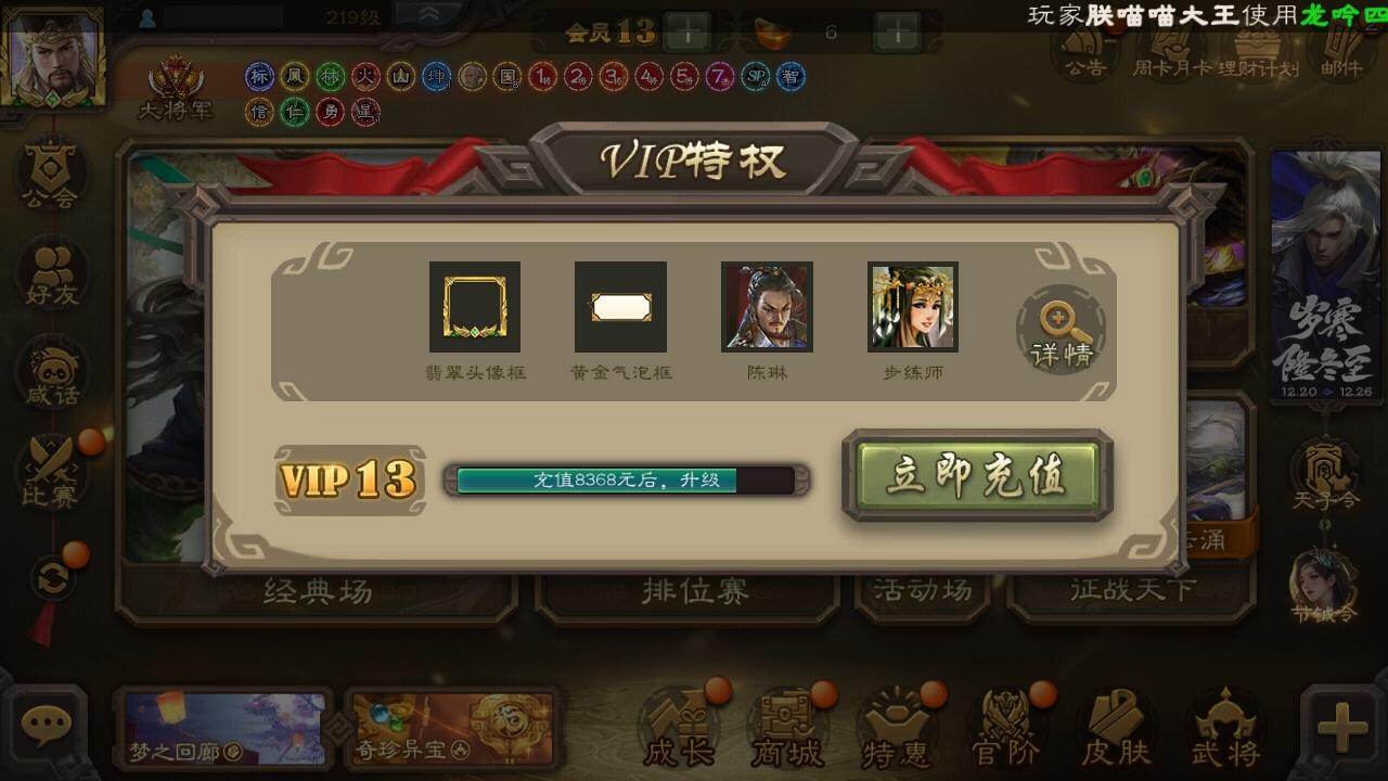 官阶:大将军;VIP等级:VIP13;史诗武将数量:57;动态皮肤数量:34