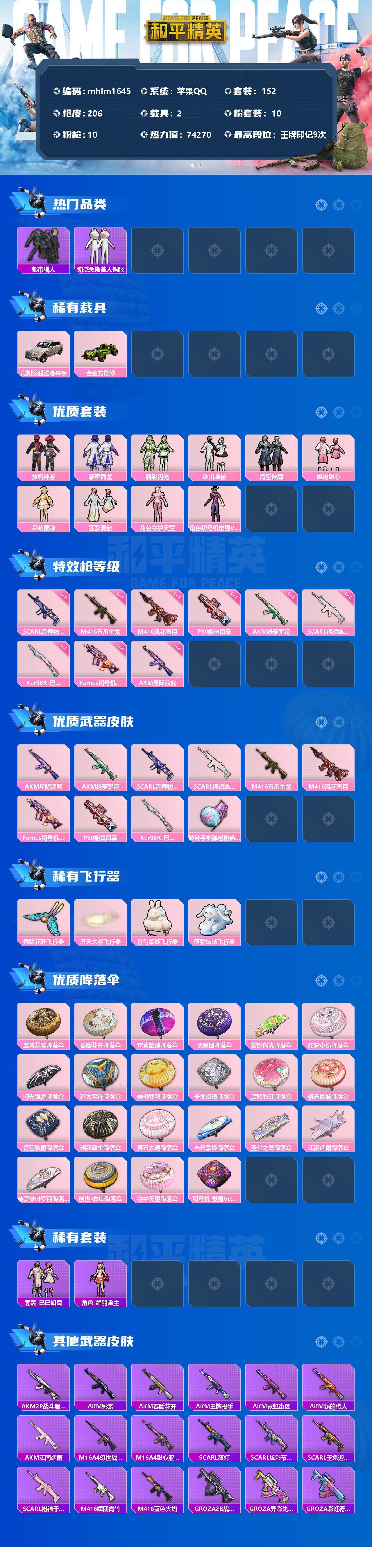 苹果 手Q-10粉装-10特效枪-2载具-4粉色飞行器-74270热力值-9王牌印记-152套装-206枪皮