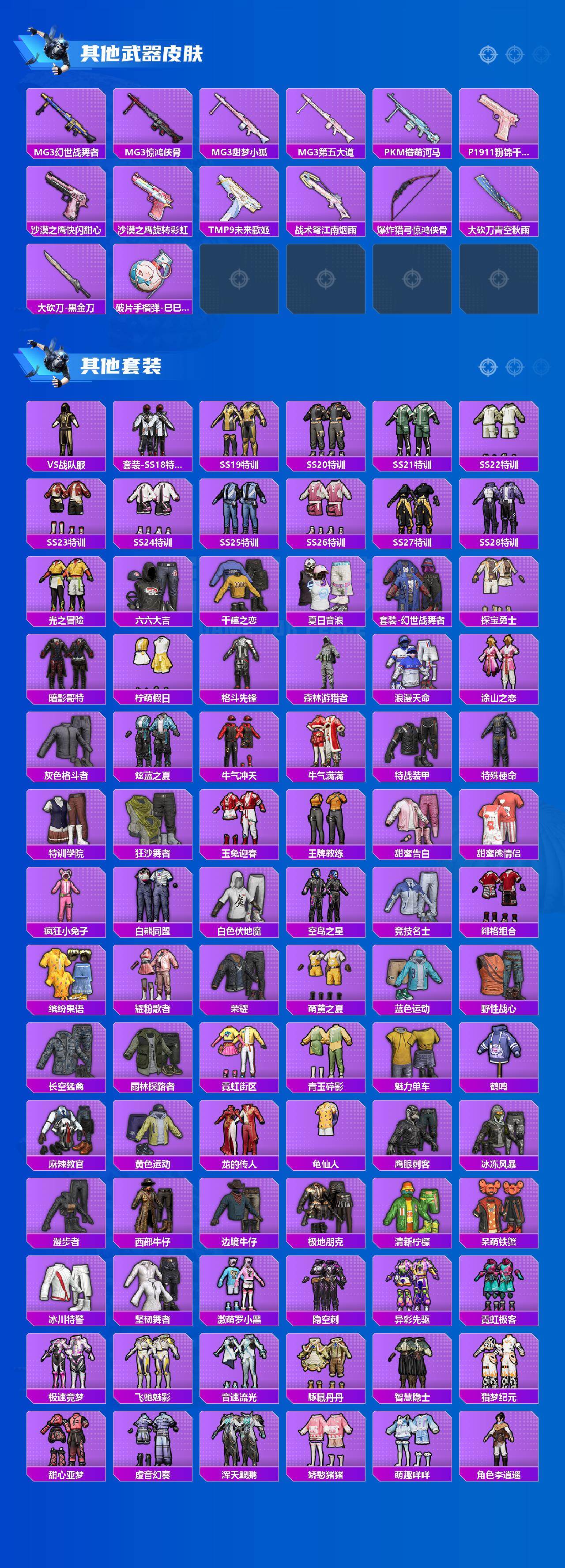 【粉色套装】:粉装-放客神游,粉装-新星烈龙,粉装-碧影闪光,粉装-冰川幽秘,粉装-青空秋雨,粉装-飒粉甜心,角色-呆萌星弥,粉装-莲影清波,角色-守护天翼,角色-初号机 觉醒Ver.