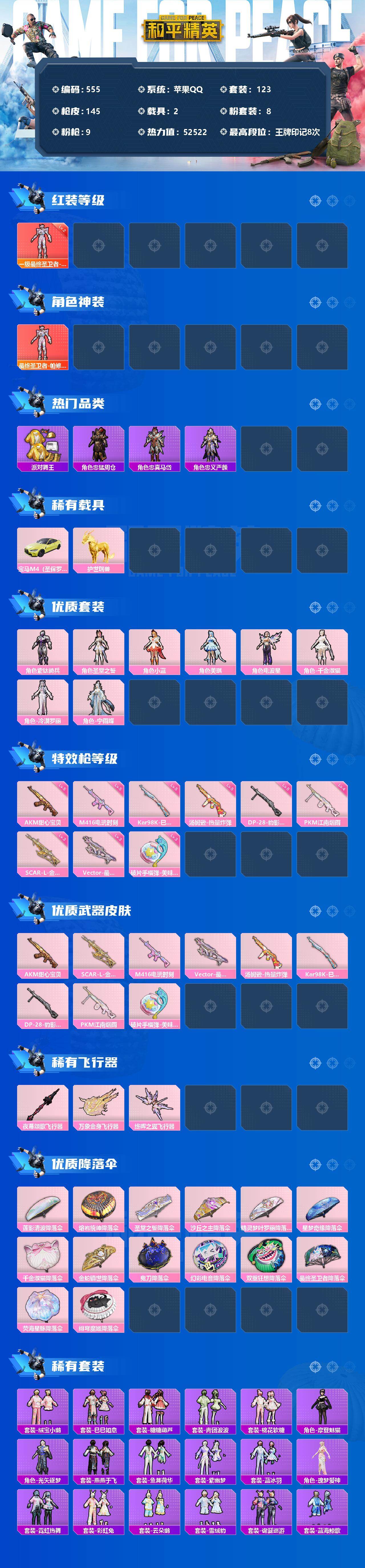 【商品标题】:苹果 手Q-1神装-8粉装-9特效枪-2载具-4粉色飞行器-52522热力值-8王牌印记-123套装-145枪皮