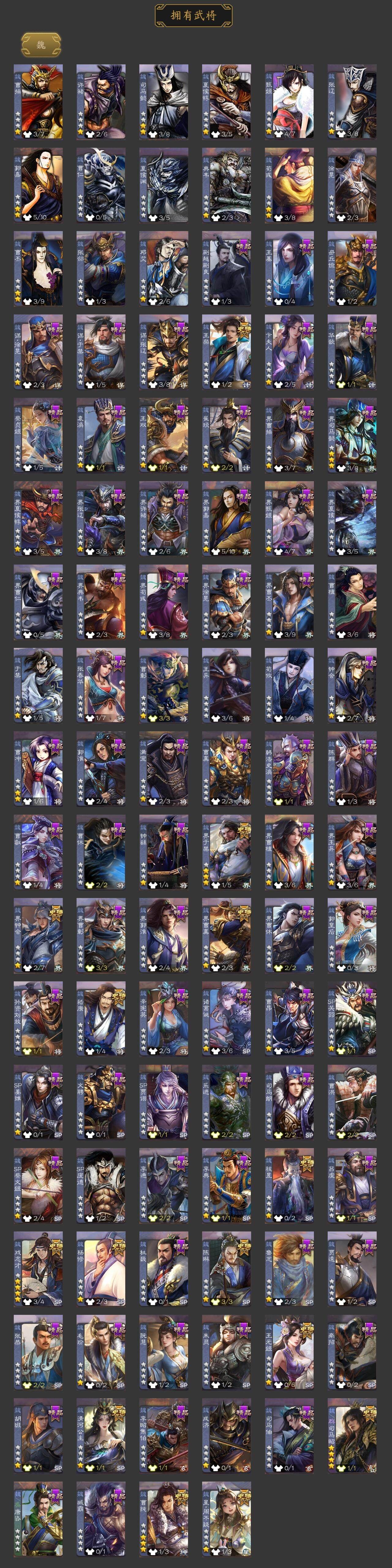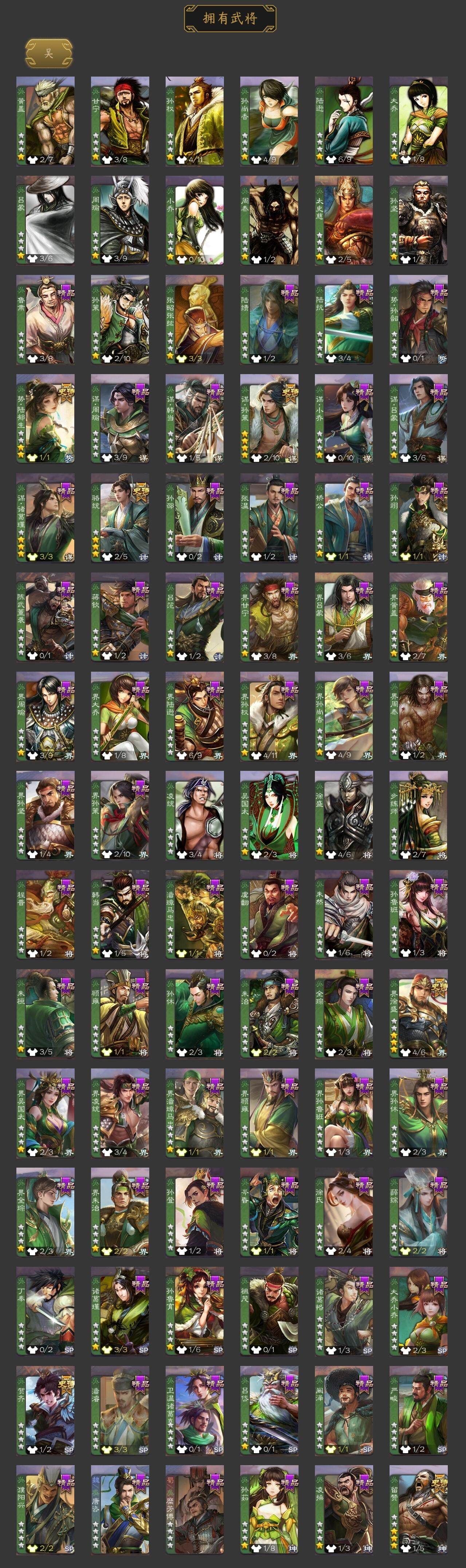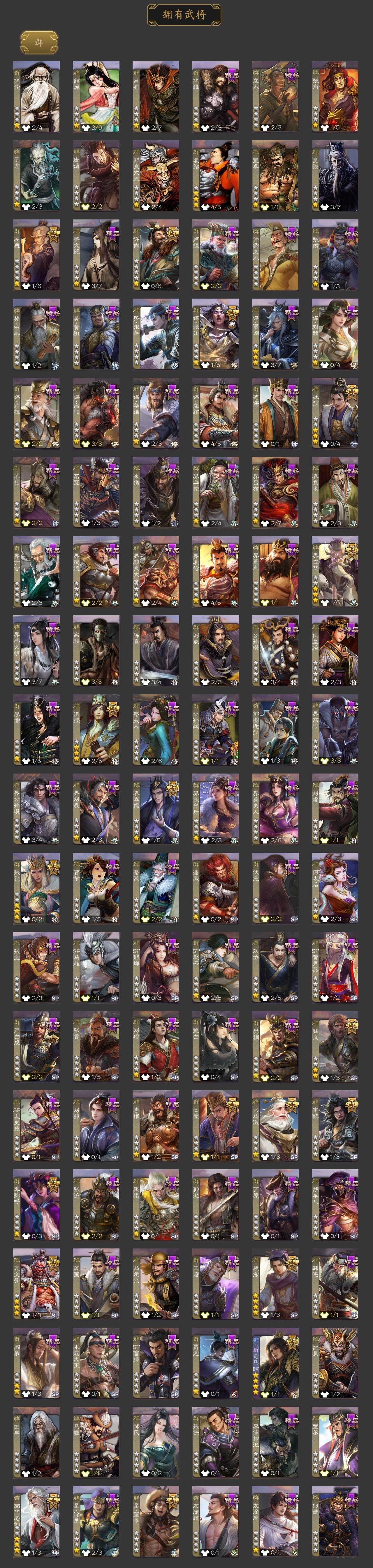 神吕布,神赵云,神郭嘉,神荀彧,神吕蒙,神周瑜,神诸葛亮,星周不疑,王粲,杨修,王元姬,魏-司马昭,界钟会,界于禁,界曹真,嵇康,陈琳,曹纯,戏志才,清河公主,关索,谋黄忠,谋赵云,谋马超,诸葛瞻,赵襄,沙摩柯,谯周,花鬘,董允,谋孙策,骆统,留赞,界徐盛,贺齐,势陆郁生,谋黄月英,