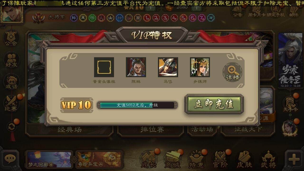 官阶:大将军;VIP等级:VIP10;史诗武将数量:51;动态皮肤数量:44