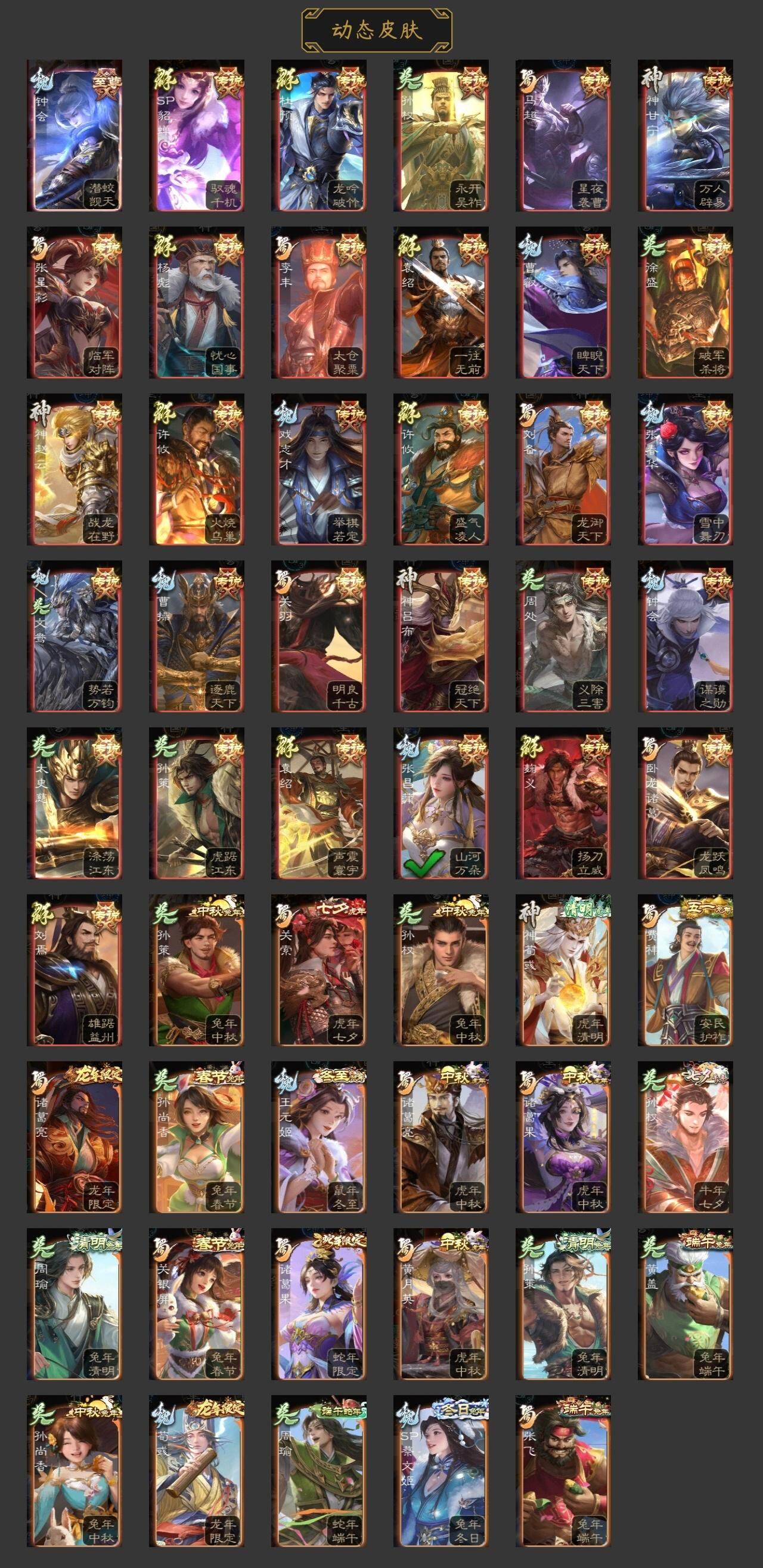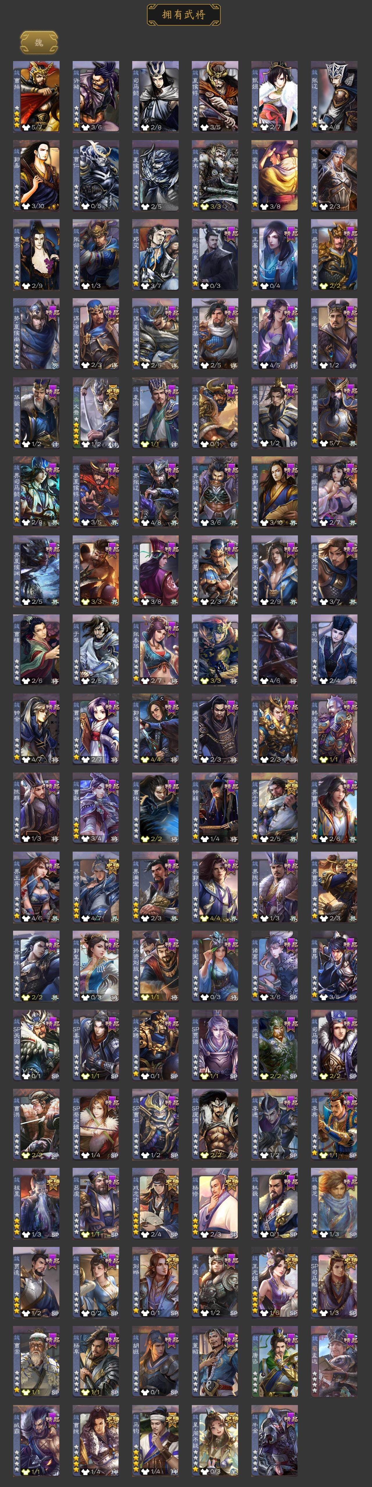神吕布,神赵云,神甘宁,神张辽,神孙策,SP司马昭,星周不疑,杨修,王元姬,马钧,界钟会,界于禁,界曹真,曹纯,戏志才,刘晔,程昱,关索,谋刘备,马云騄,谋赵云,谋马超,诸葛瞻,张星彩,沙摩柯,谯周,界黄忠,花鬘,董允,谋黄盖,周处,吴景,骆统,留赞,界朱然,界徐盛,文鸯,裴秀,