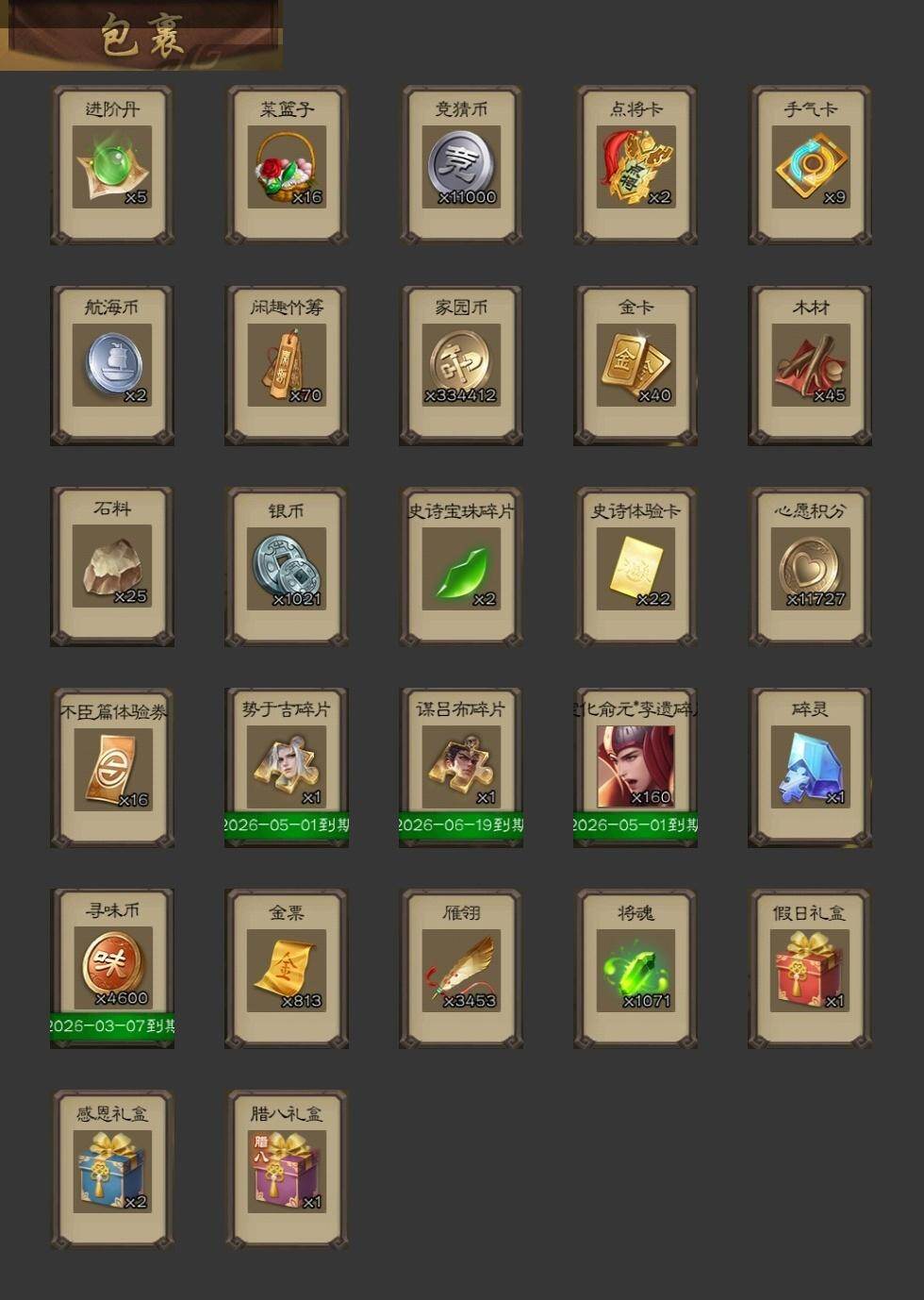 官阶:大将军;VIP等级:VIP11;史诗武将数量:54;动态皮肤数量:45;武将总数:414;史诗宝珠数量:0;将魂数量:1071;神将:5;魏国史诗武将:20;蜀国史诗武将:12;吴国史诗武将:9;群史诗武将:17