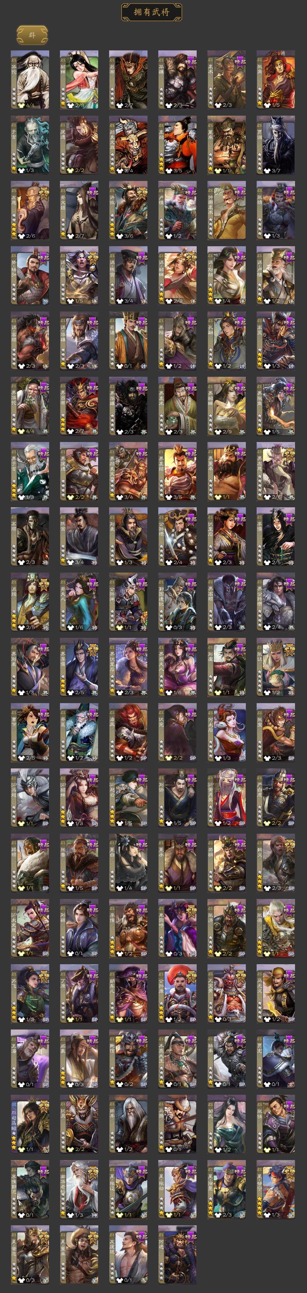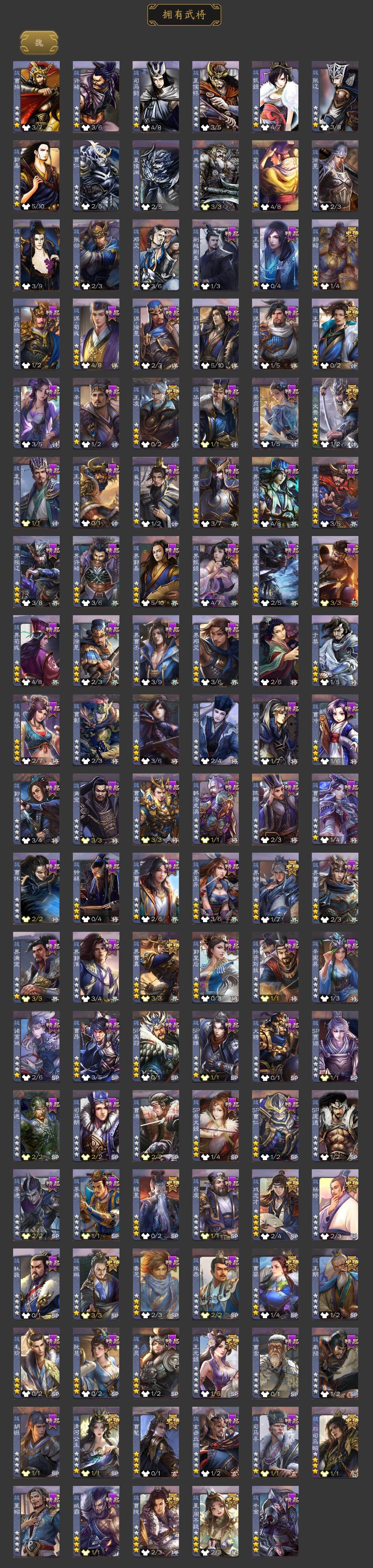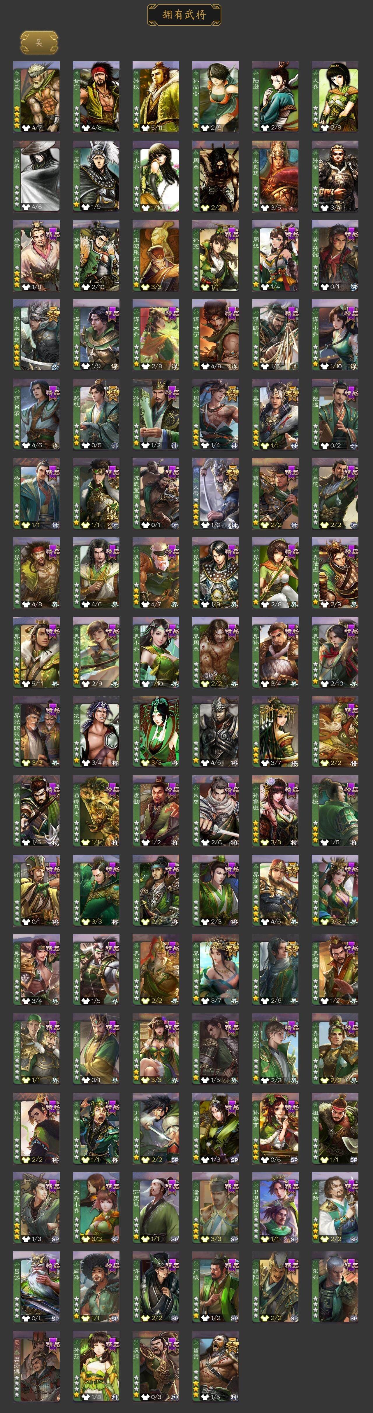 神吕布,神赵云,神陆逊,神刘备,神张辽,神吕蒙,神周瑜,曹髦,星周不疑,王粲,杨修,文鸯,王元姬,王凌,王朗,魏-司马昭,界钟会,界曹真,郝昭,陈琳,曹婴,曹纯,戏志才,清河公主,谋诸葛亮,马云騄,谋赵云,谋马超,诸葛瞻,赵襄,王平,沙摩柯,谯周,界黄忠,花鬘,董允,周处,吴景,