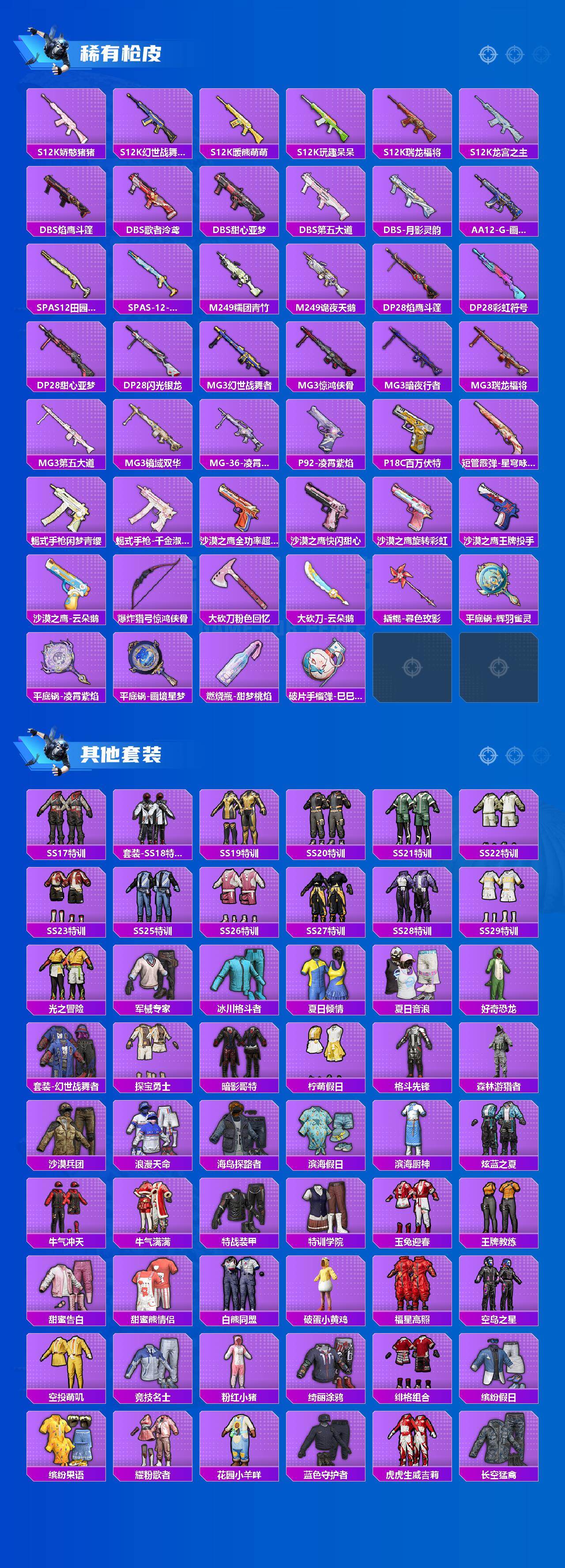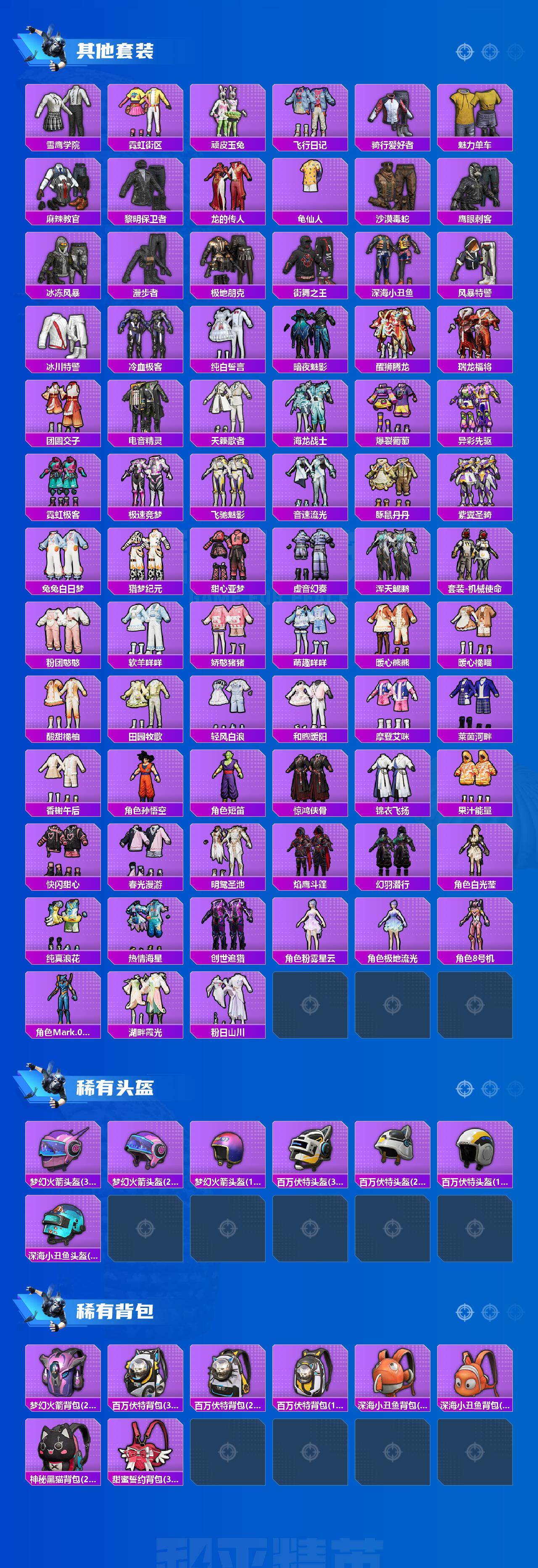 【热门品类】:粉装-梦幻火箭,粉装-音爆索尼克,套装-浪漫天命,套装-都市猎人,套装-深海小丑鱼,角色-军刀雅典娜,套装-暗夜行者,套装-龟仙人,套装-暗影哥特,套装-粉红小猪,角色-8号机,角色-Mark.