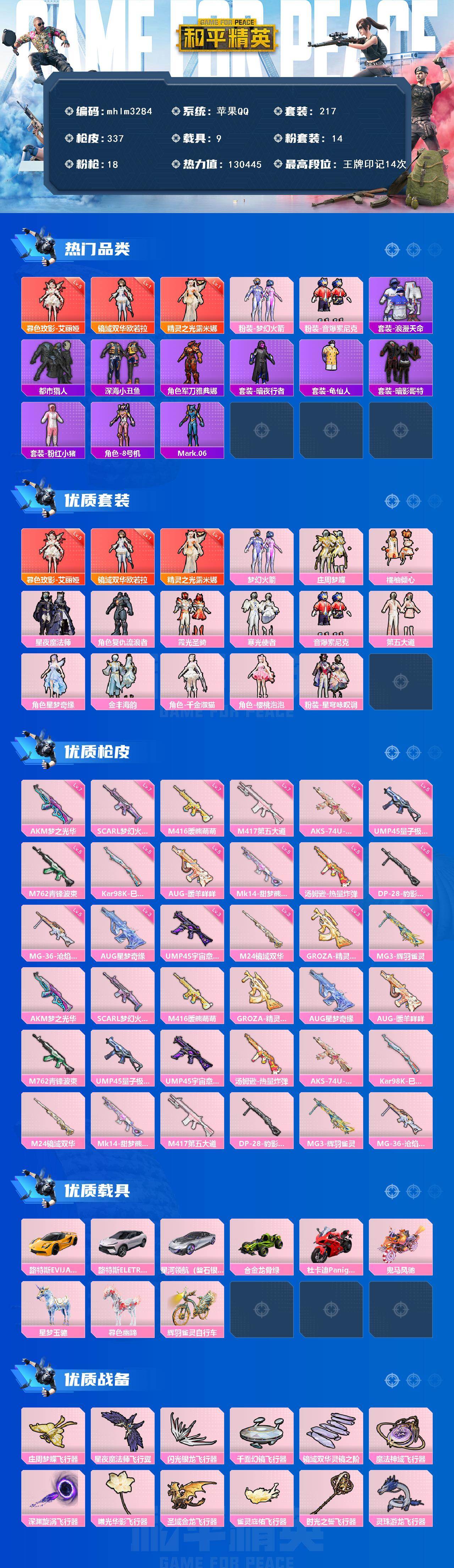 苹果 手Q-3神装-14粉装-18特效枪-9载具-13粉色飞行器-130445热力值-14王牌印记-217套装-337枪皮