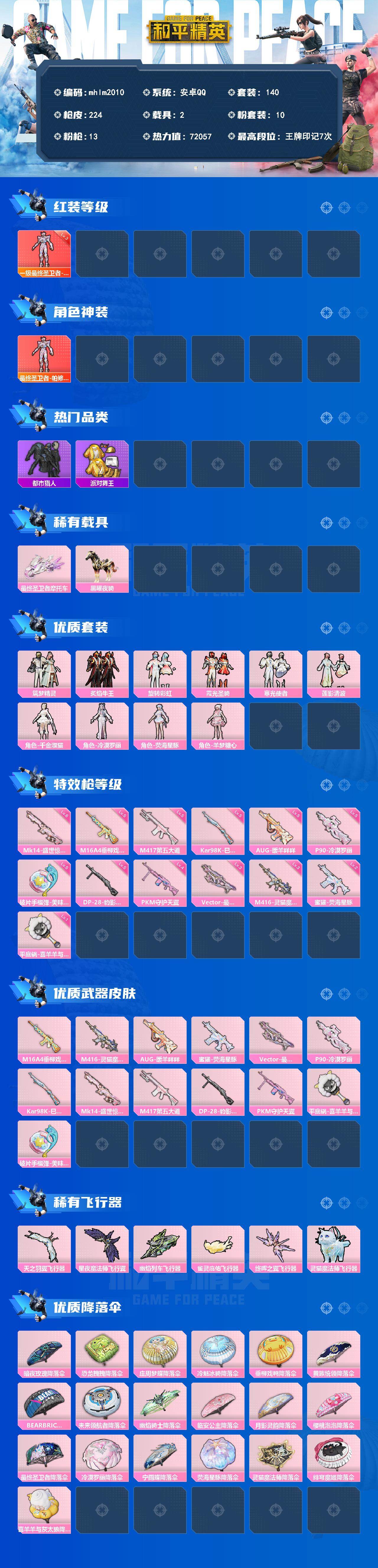 安卓 手Q-1神装-10粉装-13特效枪-2载具-6粉色飞行器-72057热力值-7王牌印记-140套装-224枪皮