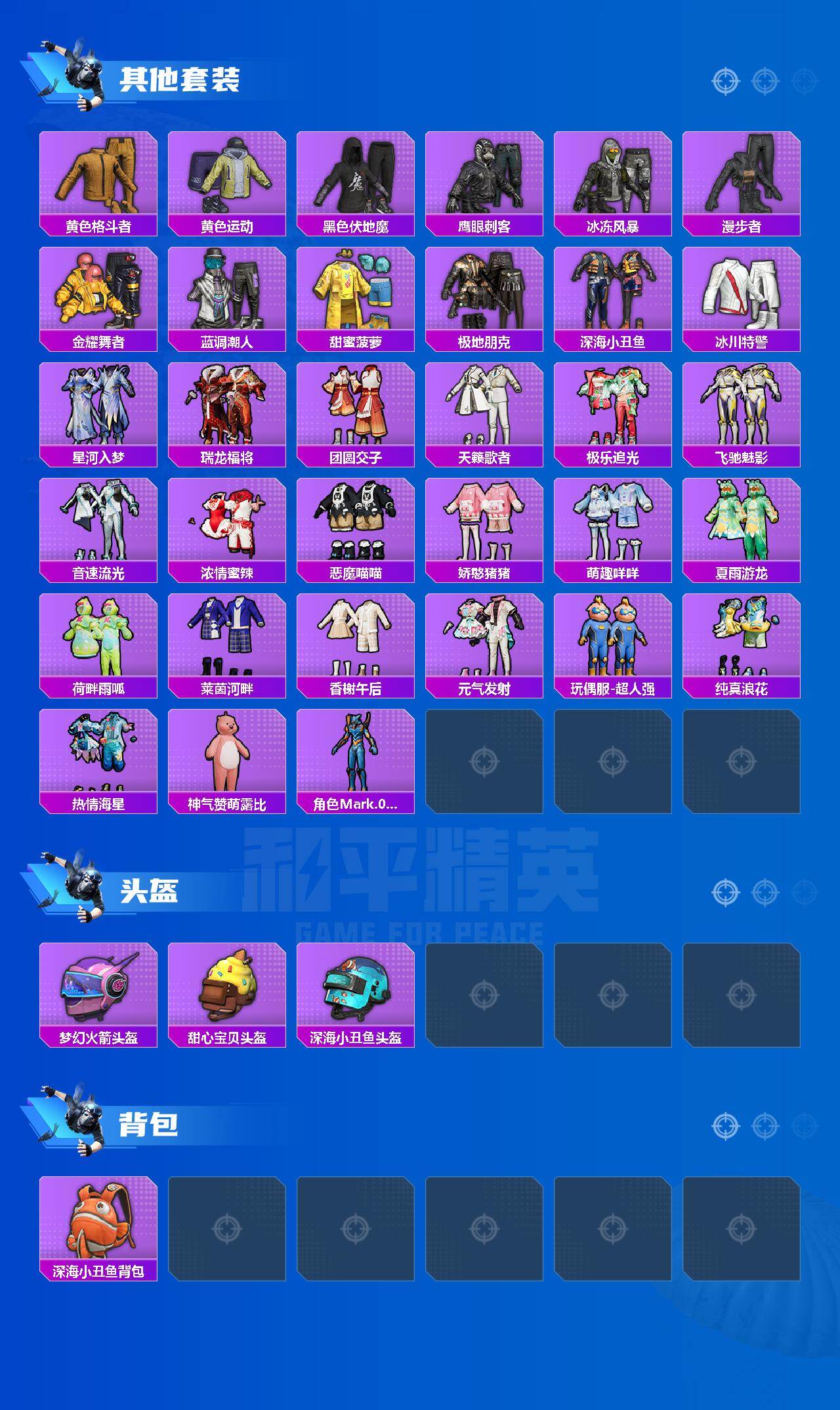 【热门品类】:套装-都市猎人,套装-派对舞王,套装-深海小丑鱼,套装-粉红小猪,角色-Mark.06