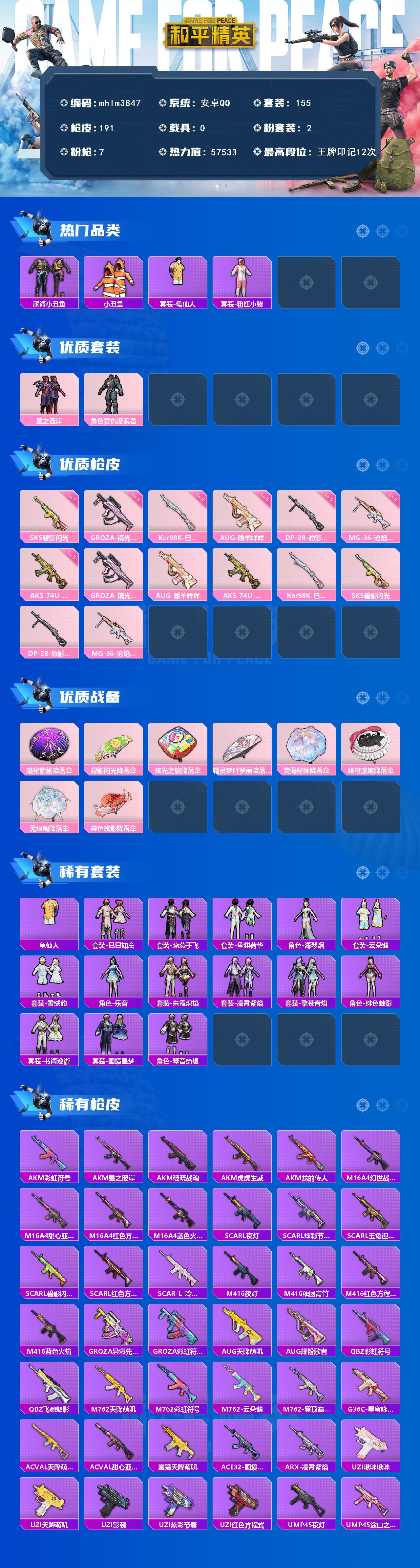 安卓 手Q-2粉装-7特效枪-0载具-1粉色飞行器-57533热力值-12王牌印记-155套装-191枪皮
