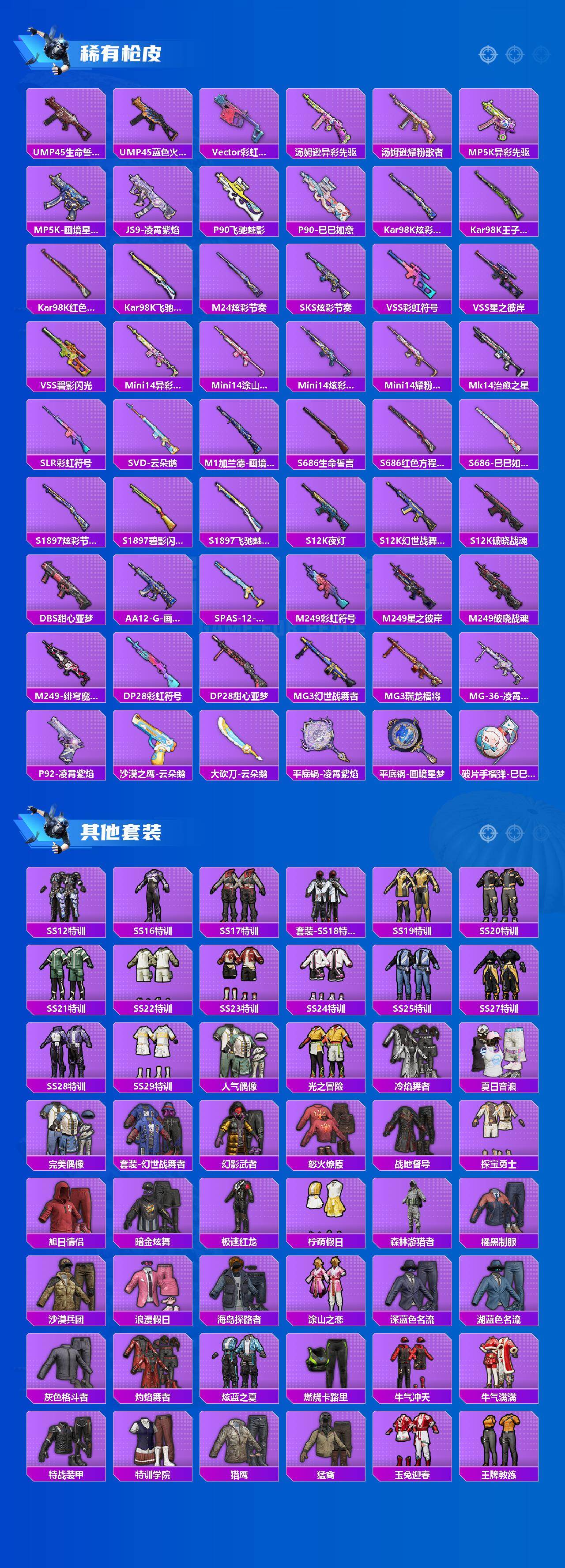 【粉色枪皮等级】:GROZA-镜光银凌(五级),AUG-暖羊咩咩(五级),AKS-74U-森灵之息(五级),Kar98K-巳巳如意(五级),SKS-碧影闪光(七级),DP-28-豹影疾电(五级),MG-36-沧焰双生(五级)