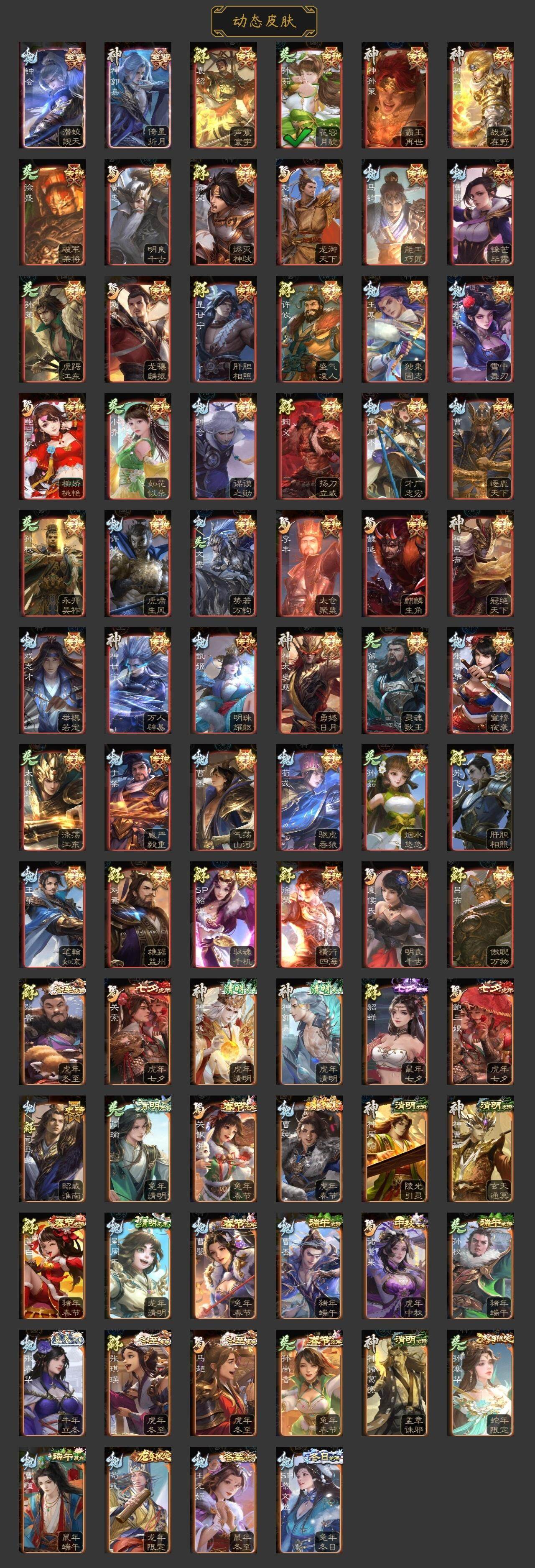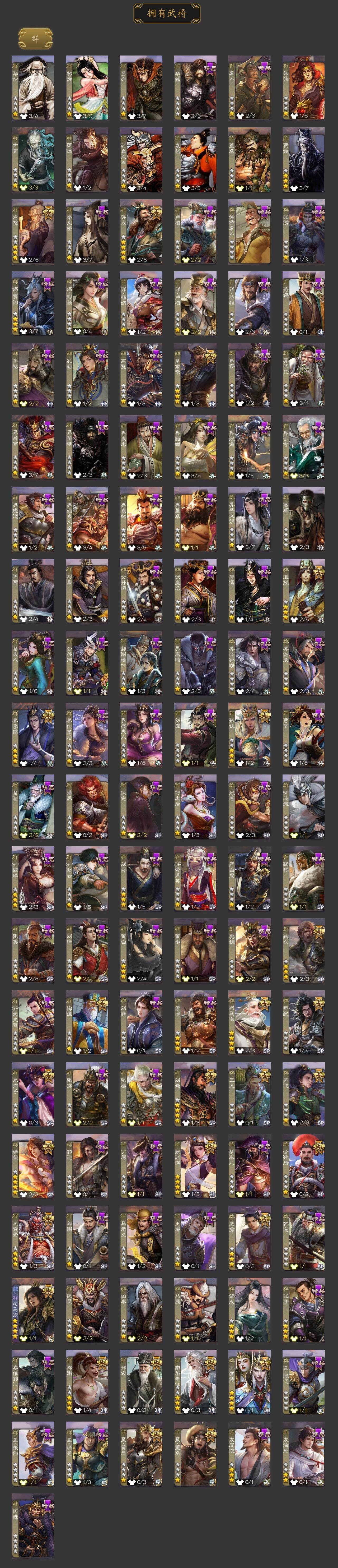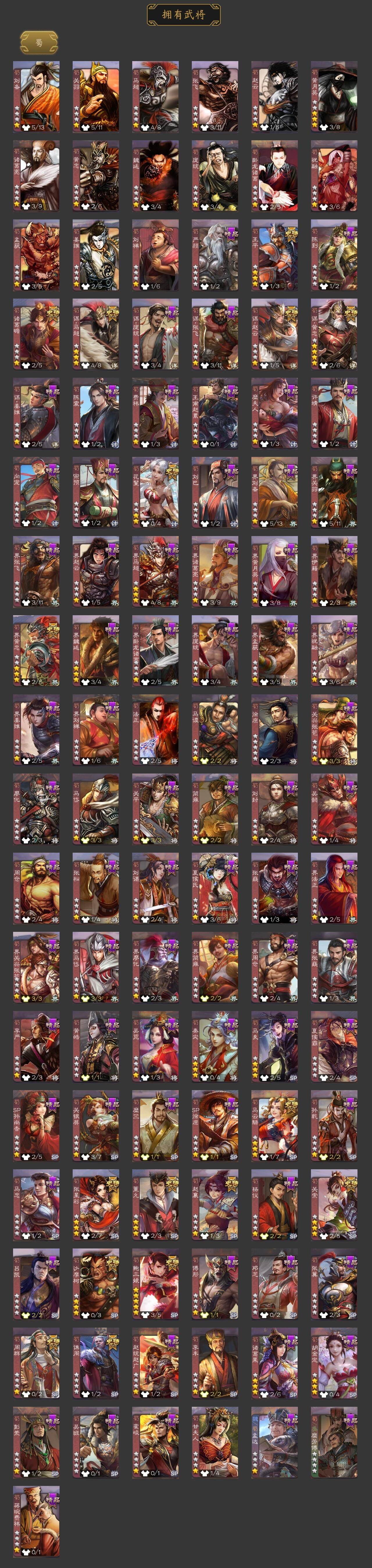 神吕布,神赵云,神陆逊,神刘备,神甘宁,神张辽,神郭嘉,神太史慈,神孙策,神荀彧,神关羽,神吕蒙,神周瑜,神诸葛亮,SP司马昭,王粲,杨修,文鸯,王元姬,魏-司马昭,马钧,界钟会,界于禁,界曹真,嵇康,郝昭,陈琳,曹婴,曹纯,戏志才,刘晔,关索,马云騄,谋黄忠,谋赵云,谋马超,