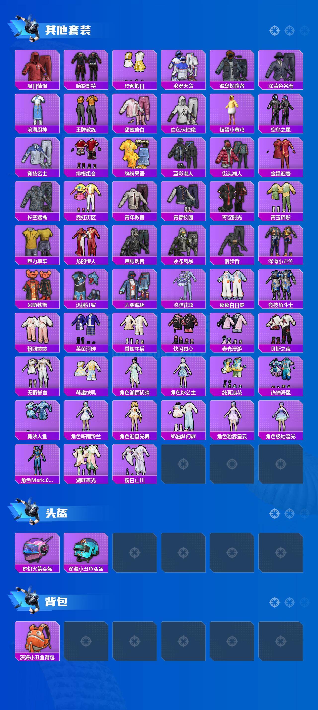 【热门品类】:套装-浪漫天命,套装-深海小丑鱼,套装-小丑鱼,套装-胖达圆圆,套装-AG战队服,套装-暗影哥特,角色-Mark.06