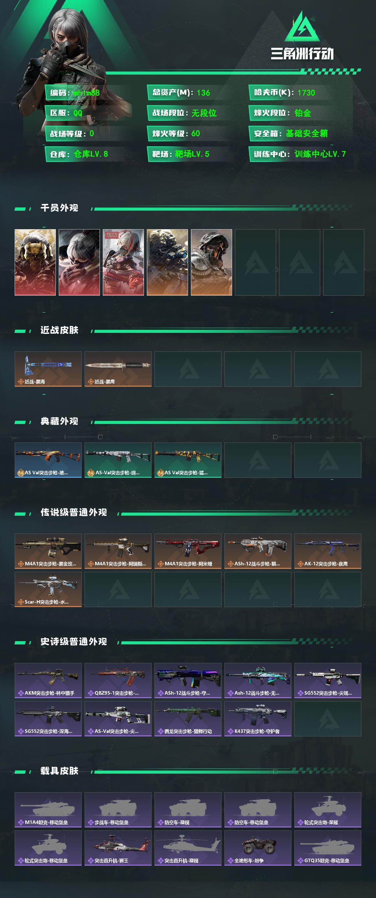 总资产:135.5M,哈夫币:173W,武器皮肤166,烽火60级:铂金,通行证1级:通行证免费版 【安全箱】基础安全箱;【特勤处等级】仓库LV.8,指挥中心LV.5,训练中心LV.7,靶场LV.5,潜水中心LV.0,收藏室LV.0;【干员皮肤5】:红狼蚀金玫瑰,骇爪水墨云图,骇爪维什戴尔,无名夜鹰,深蓝不破誓约;【已有捆绑包4】:蚀金玫瑰捆绑包,维什戴尔捆绑包,鹅鸭杀捆绑包,曙光捆绑包;【近战皮肤】:近战武器-黑海,近战武器-黑鹰;【步枪皮肤】:CAR-15突击步枪-阿米娅,G3战斗步枪-骑士