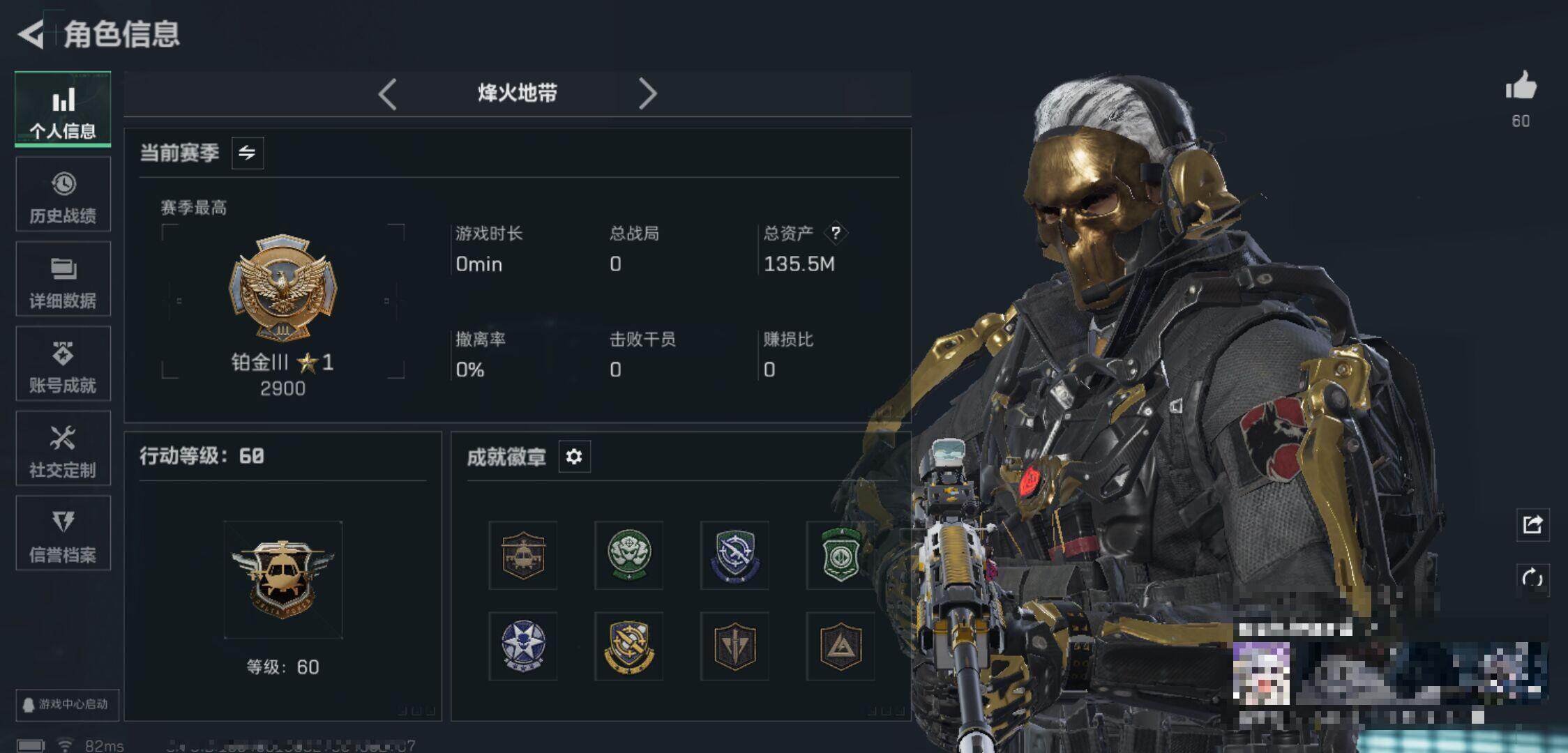 总资产:135.5M,哈夫币:173W,武器皮肤166,烽火60级:铂金,通行
