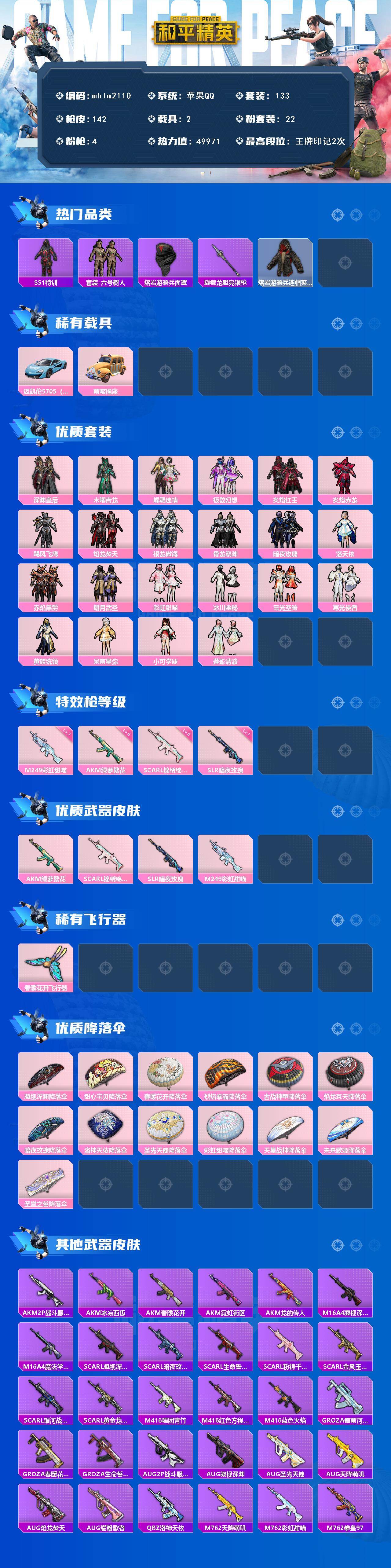 苹果 手Q-22粉装-4特效枪-2载具-1粉色飞行器-49971热力值-2王牌印记-133套装-142枪皮