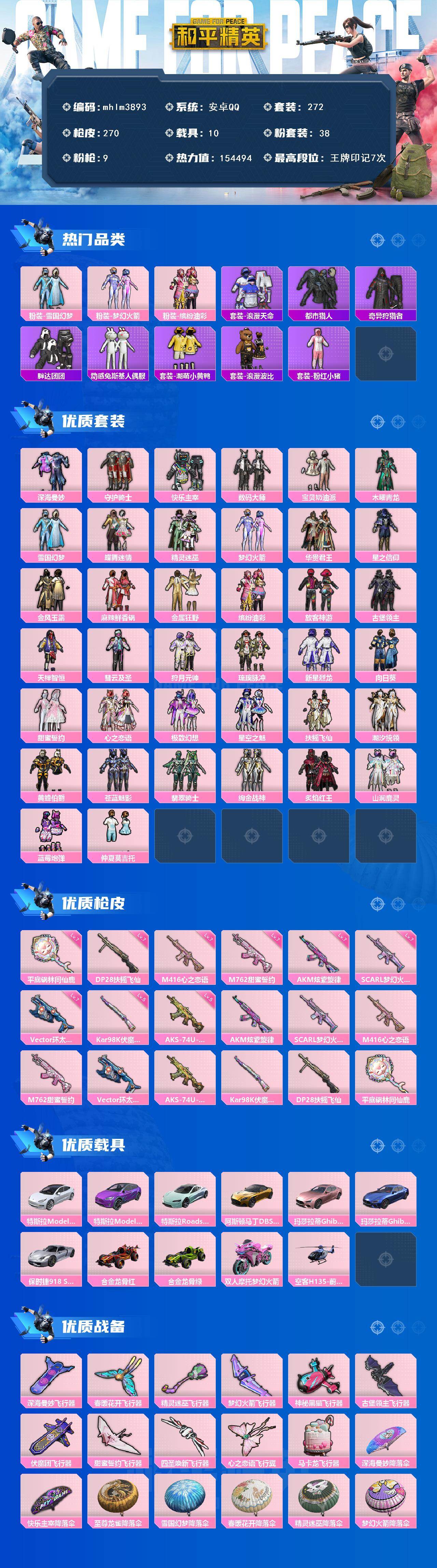 安卓 手Q-38粉装-9特效枪-10载具-13粉色飞行器-154494热力值-7王牌印记-272套装-270枪皮