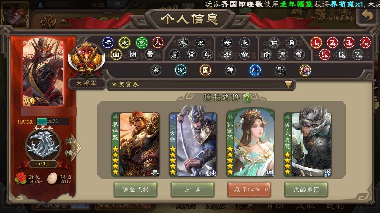 官阶:大将军;VIP等级:VIP9;史诗武将数量:40;动态皮肤数量:28;