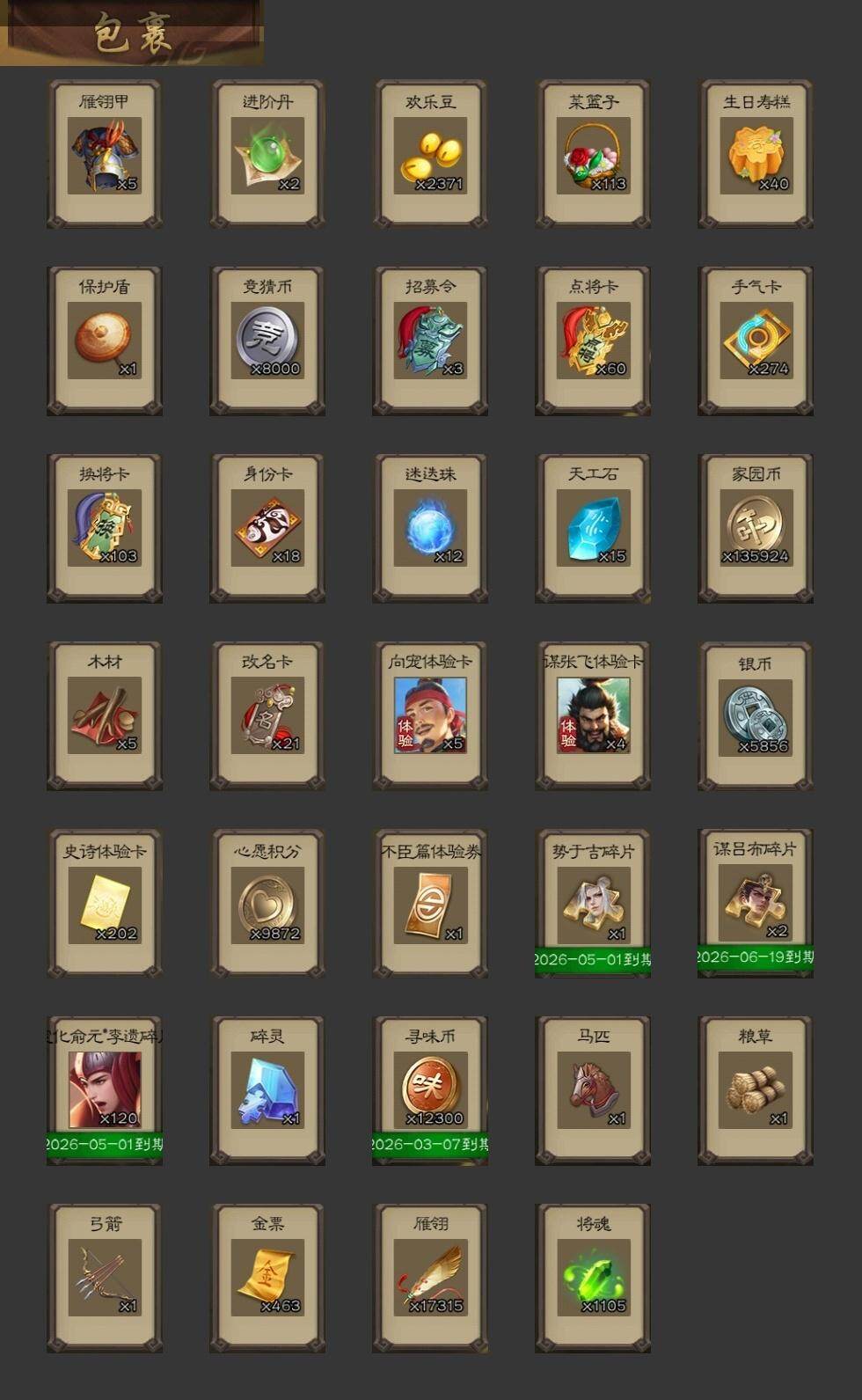 官阶:大将军;VIP等级:VIP9;史诗武将数量:40;动态皮肤数量:28;武将总数:354;史诗宝珠数量:0;将魂数量:1105;神将:6;魏国史诗武将:18;蜀国史诗武将:6;吴国史诗武将:9;群史诗武将:11