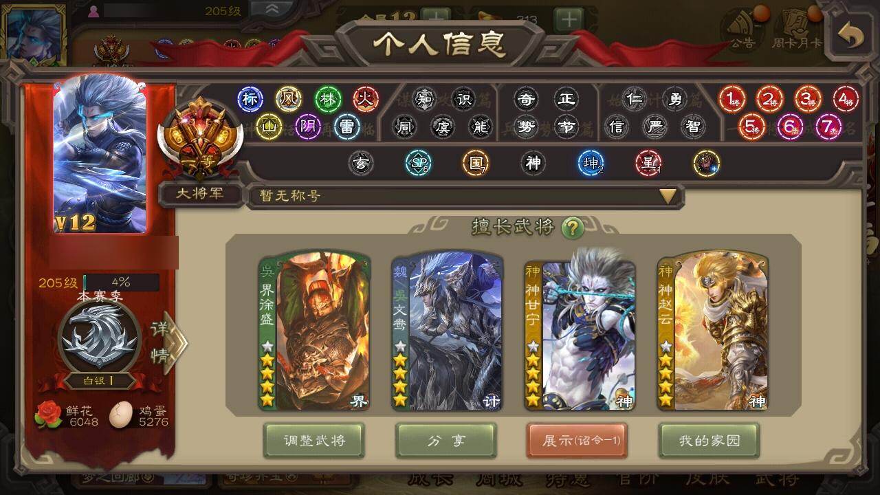 官阶:大将军;VIP等级:VIP12;史诗武将数量:67;动态皮肤数量:60;武将总数:453;史诗宝珠数量:2;将魂数量:3980;神将:8;魏国史诗武将:38;蜀国史诗武将:12;吴国史诗武将:12;群史诗武将:23