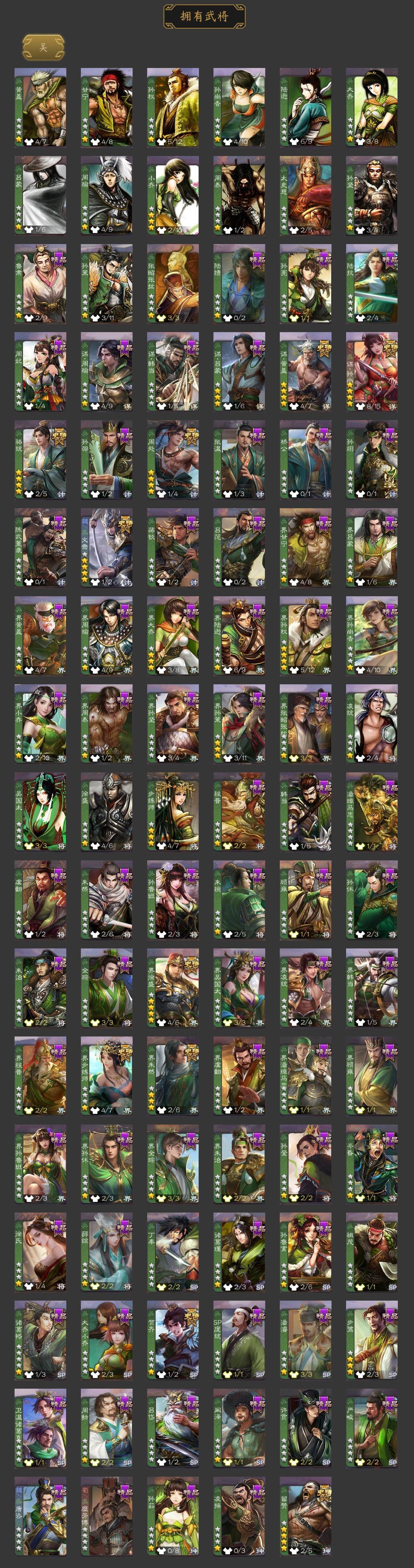 神吕布,神赵云,神陆逊,神刘备,神甘宁,神张辽,神太史慈,神诸葛亮,星周不疑,王粲,杨修,王元姬,界钟会,界于禁,界曹真,嵇康,郝昭,陈琳,曹婴,曹纯,戏志才,刘晔,程昱,马云騄,谋赵云,谋马超,诸葛瞻,赵襄,张星彩,王平,沙摩柯,界黄忠,花鬘,董允,谋关羽,谋黄盖,周处,骆统