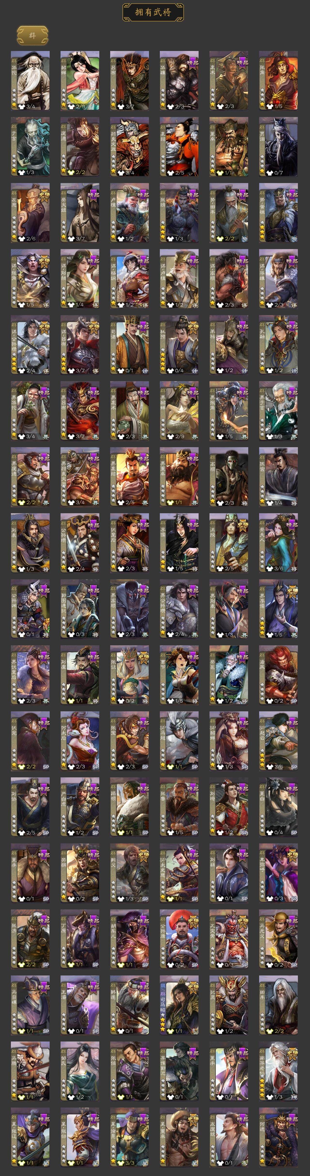 神吕布,神赵云,神陆逊,神太史慈,神吕蒙,神诸葛亮,星周不疑,杨修,文鸯,王元姬,魏-司马昭,界钟会,郝昭,曹婴,曹纯,戏志才,关索,谋诸葛亮,谋赵云,周群,赵襄,沙摩柯,花鬘,吴景,孙寒华,骆统,留赞,界徐盛,谋公孙瓒,左慈,张让,麹义,南华老仙,沮授,界李儒,公孙康,杜预,卑弥呼