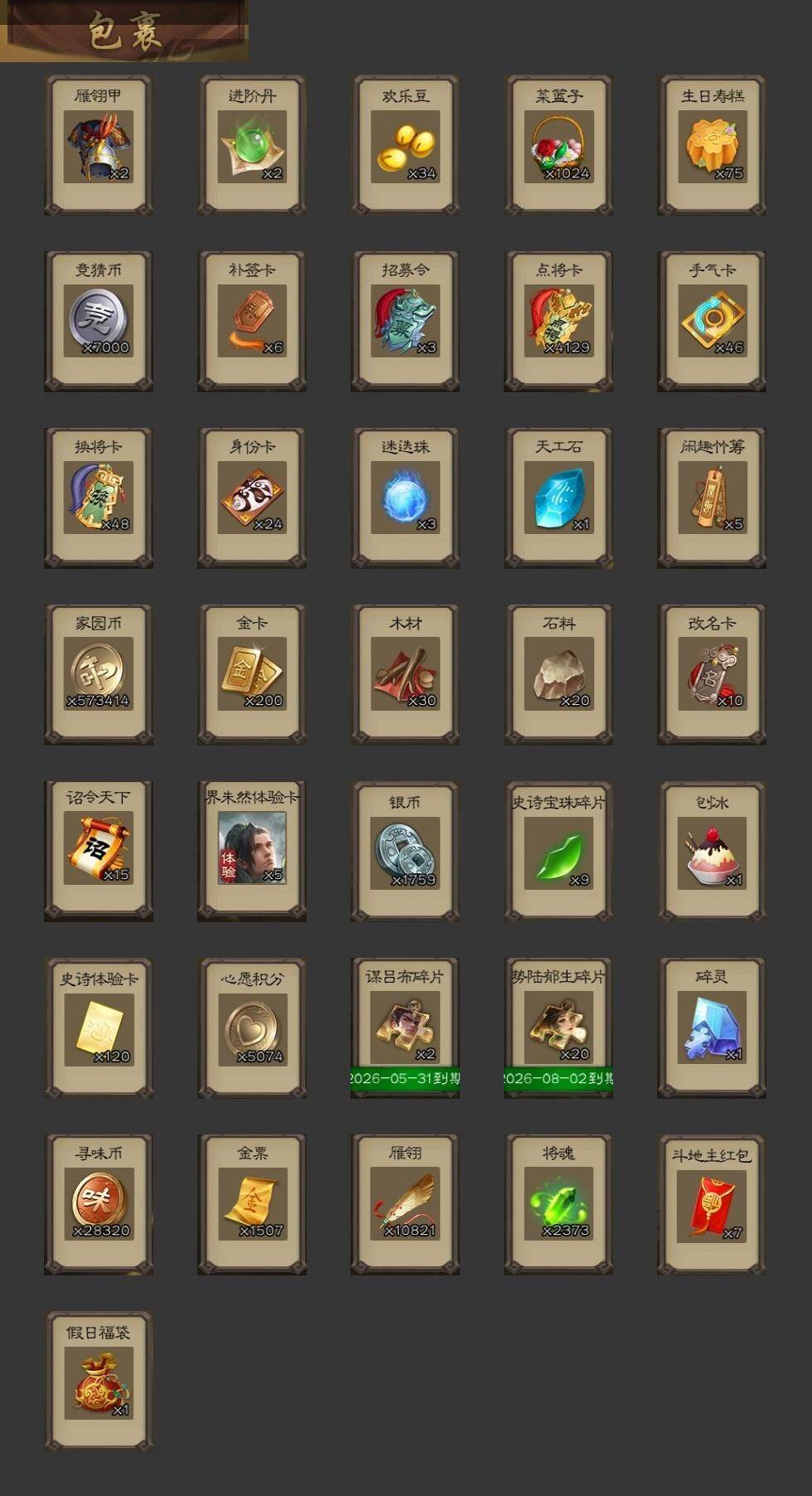 官阶:大将军;VIP等级:VIP9;史诗武将数量:41;动态皮肤数量:31;武将总数:371;史诗宝珠数量:0;将魂数量:2373;神将:6;魏国史诗武将:20;蜀国史诗武将:7;吴国史诗武将:5;群史诗武将:14