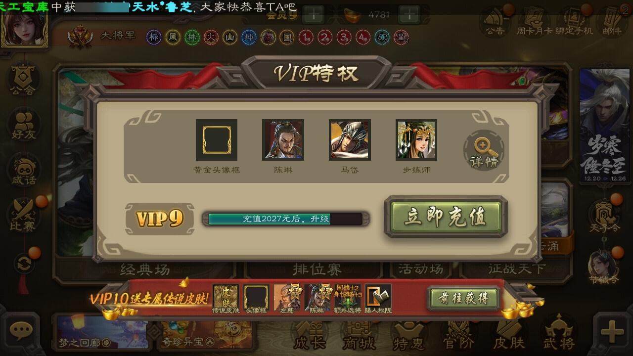 官阶:大将军;VIP等级:VIP9;史诗武将数量:41;动态皮肤数量:31;