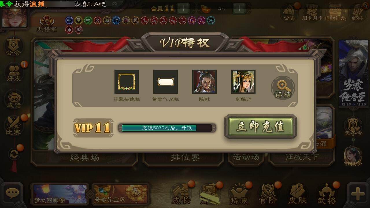 官阶:大将军;VIP等级:VIP11;史诗武将数量:49;动态皮肤数量:28