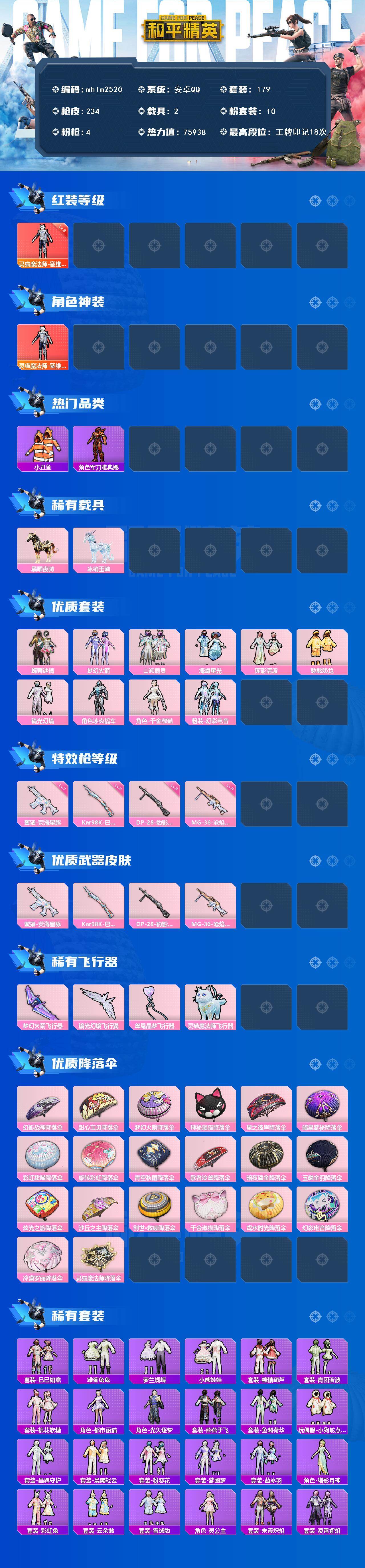 安卓 手Q-1神装-10粉装-4特效枪-2载具-5粉色飞行器-75938热力值-18王牌印记-179套装-234枪皮