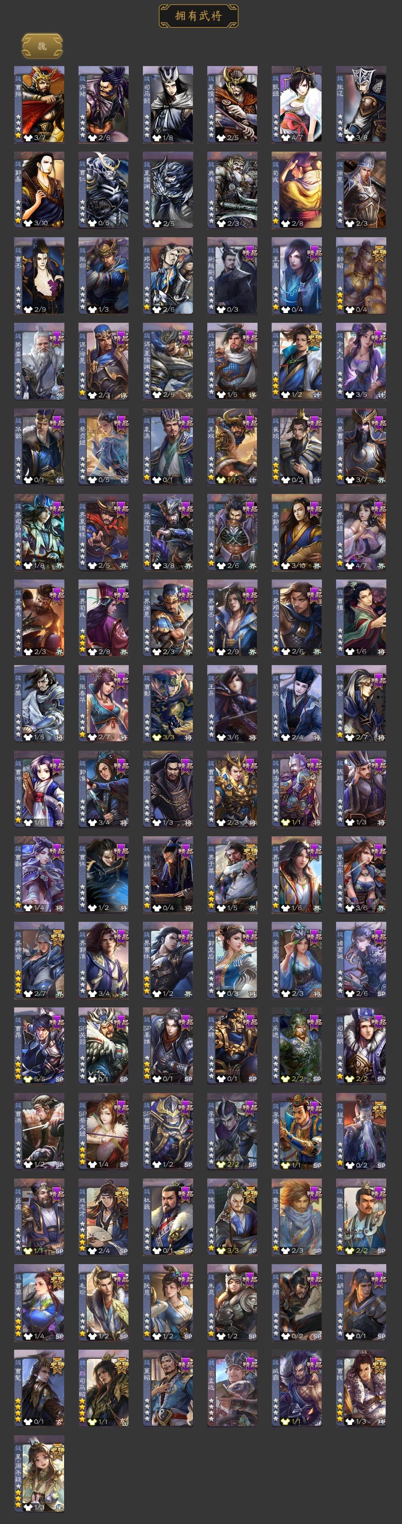 神曹操,神吕布,神赵云,神吕蒙,神周瑜,神诸葛亮,曹髦,星周不疑,王粲,魏-司马昭,界钟会,界于禁,郝昭,陈琳,曹婴,曹纯,戏志才,关索,谋马超,赵襄,张星彩,王平,沙摩柯,花鬘,董允,谋关羽,周处,吴景,界徐盛,左慈,郑玄,苏飞,麹义,南华老仙,沮授,界李儒,公孙康,谋张角,李傕,