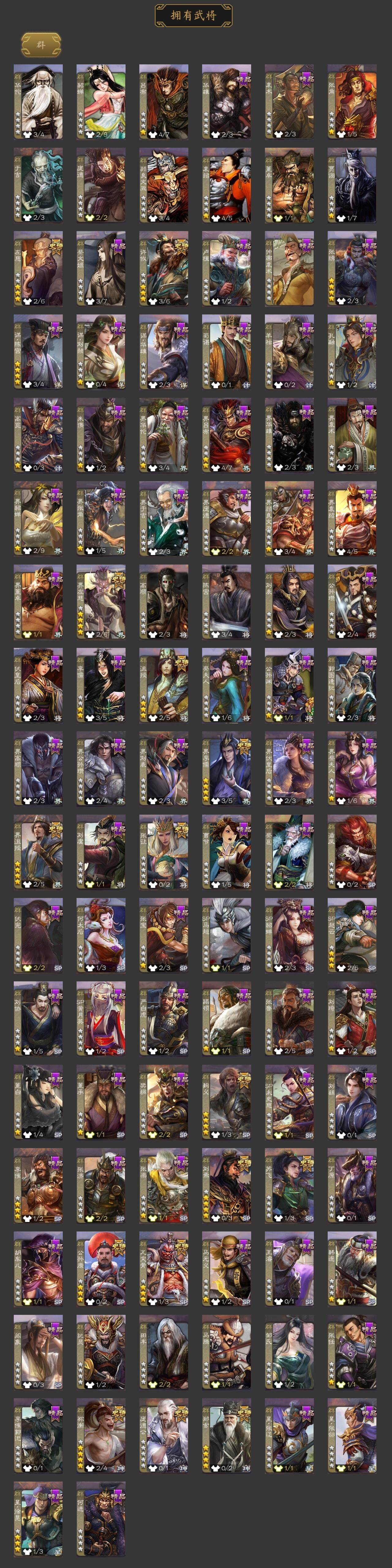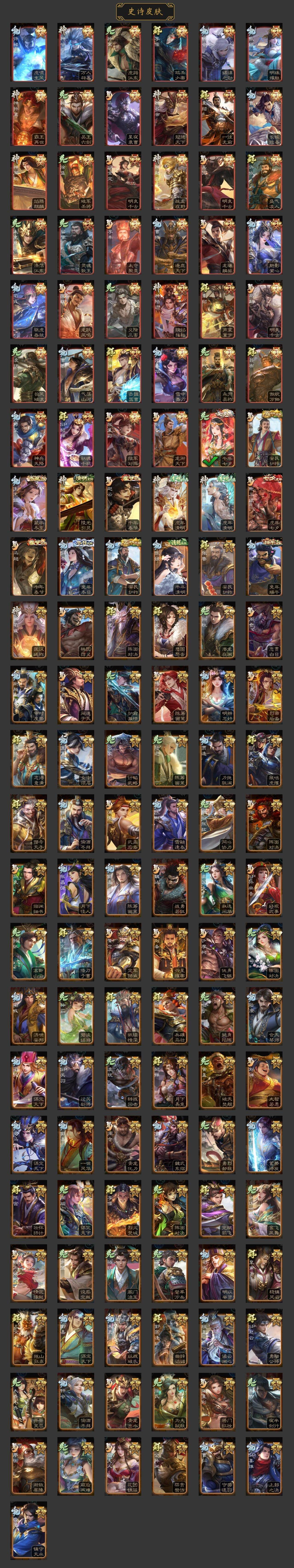 神吕布,神赵云,神陆逊,神刘备,神甘宁,神张辽,神郭嘉,神太史慈,神孙策,神荀彧,神吕蒙,神周瑜,SP司马昭,星周不疑,谋曹仁,王粲,杨修,文鸯,王元姬,界钟会,界于禁,界曹真,嵇康,曹纯,戏志才,清河公主,关索,马云騄,谋赵云,谋马超,诸葛瞻,周群,赵襄,张星彩,沙摩柯,谯