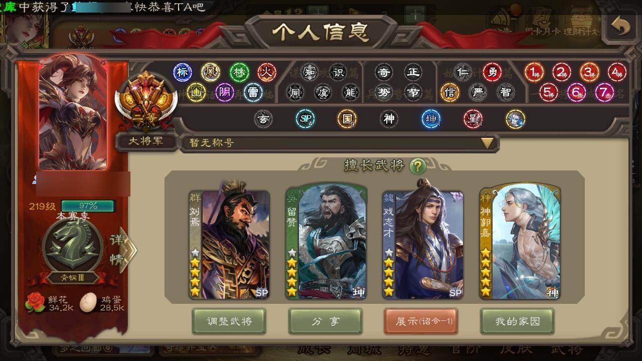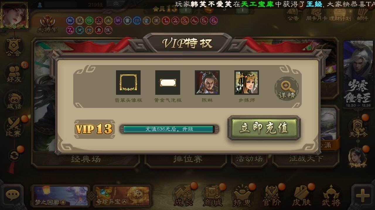 官阶:大将军;VIP等级:VIP13;史诗武将数量:67;动态皮肤数量:44