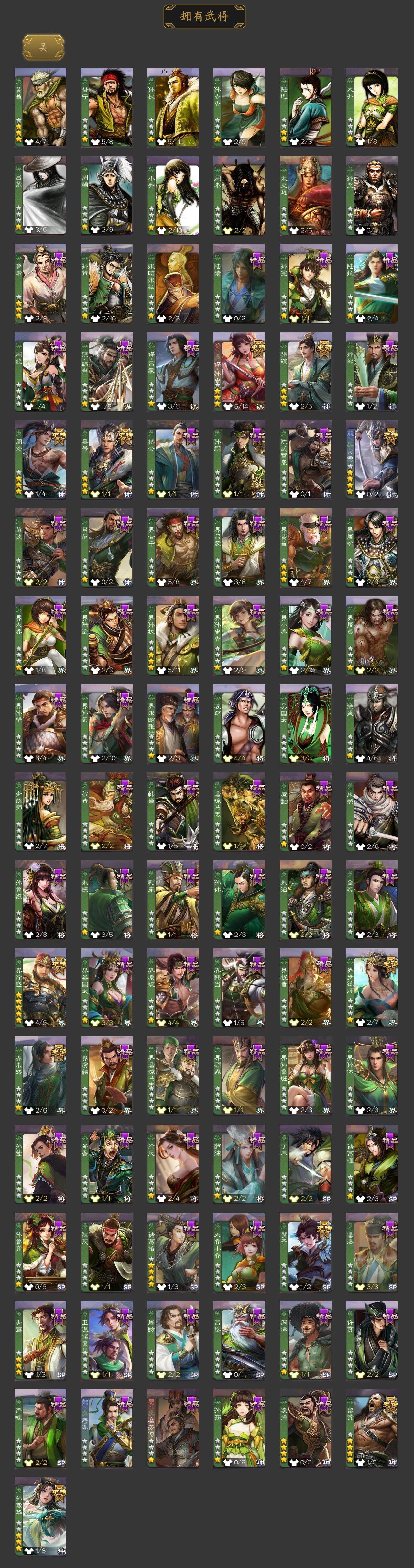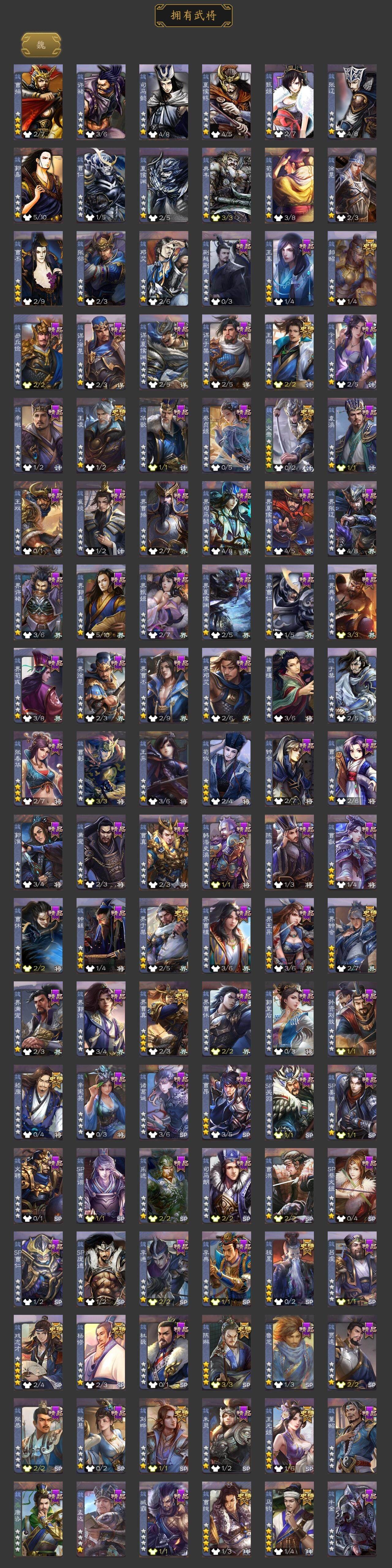 神吕布,神赵云,神陆逊,神甘宁,神郭嘉,神太史慈,神孙策,神荀彧,神吕蒙,神周瑜,神诸葛亮,王粲,杨修,文鸯,王元姬,王凌,马钧,界钟会,界于禁,界曹真,嵇康,郝昭,陈琳,曹纯,戏志才,刘晔,马云騄,谋孙尚香,谋黄忠,谋赵云,谋马超,诸葛瞻,周群,赵襄,张星彩,王平,沙摩柯,谯