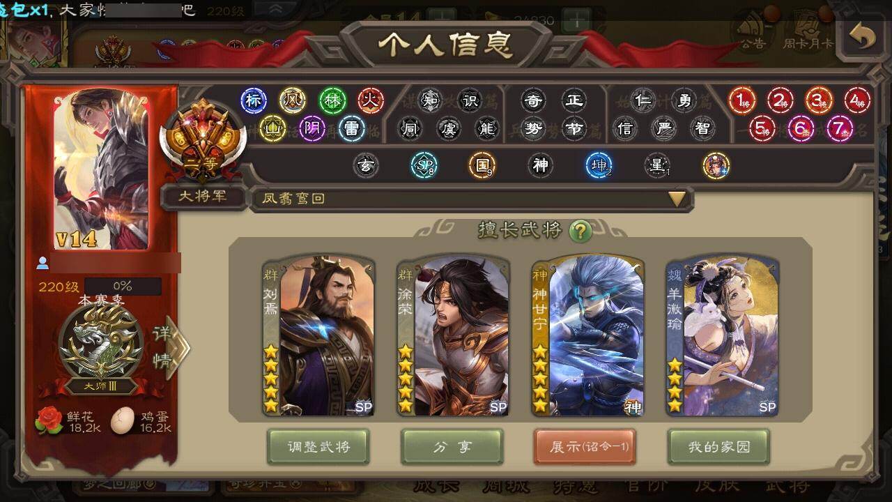 官阶:大将军;VIP等级:VIP14;史诗武将数量:66;动态皮肤数量:50;武将总数:425;史诗宝珠数量:29;将魂数量:5754;神将:7;魏国史诗武将:31;蜀国史诗武将:11;吴国史诗武将:8;群史诗武将:24