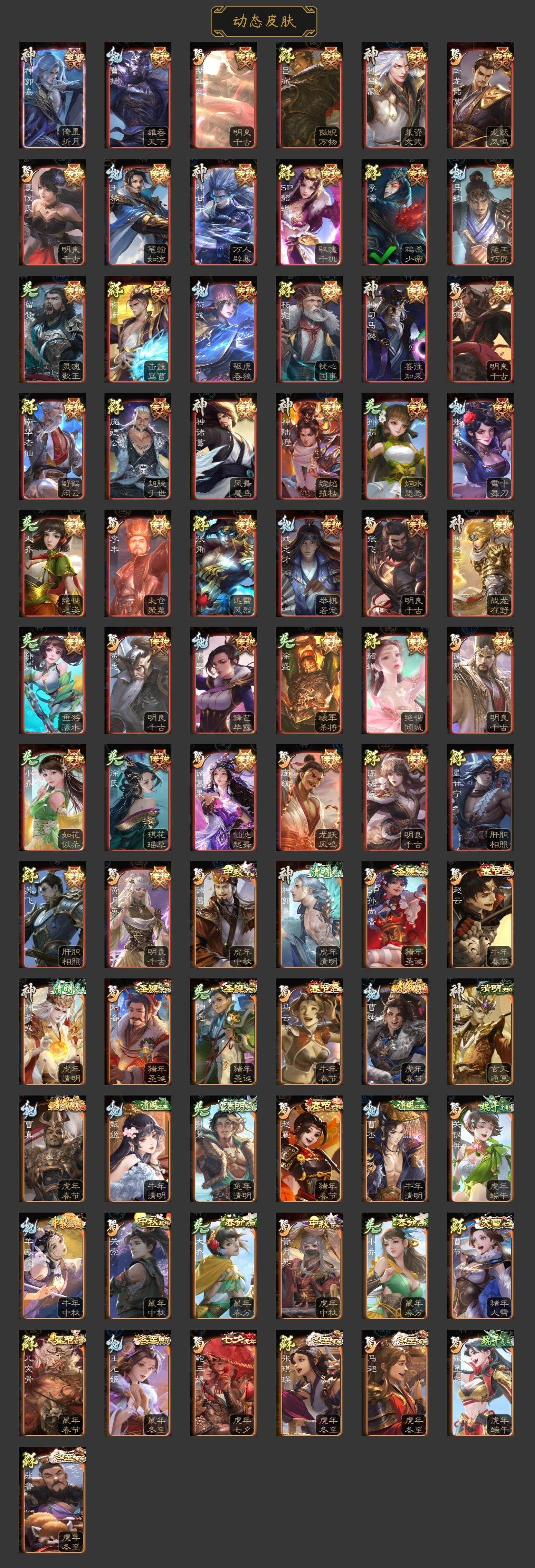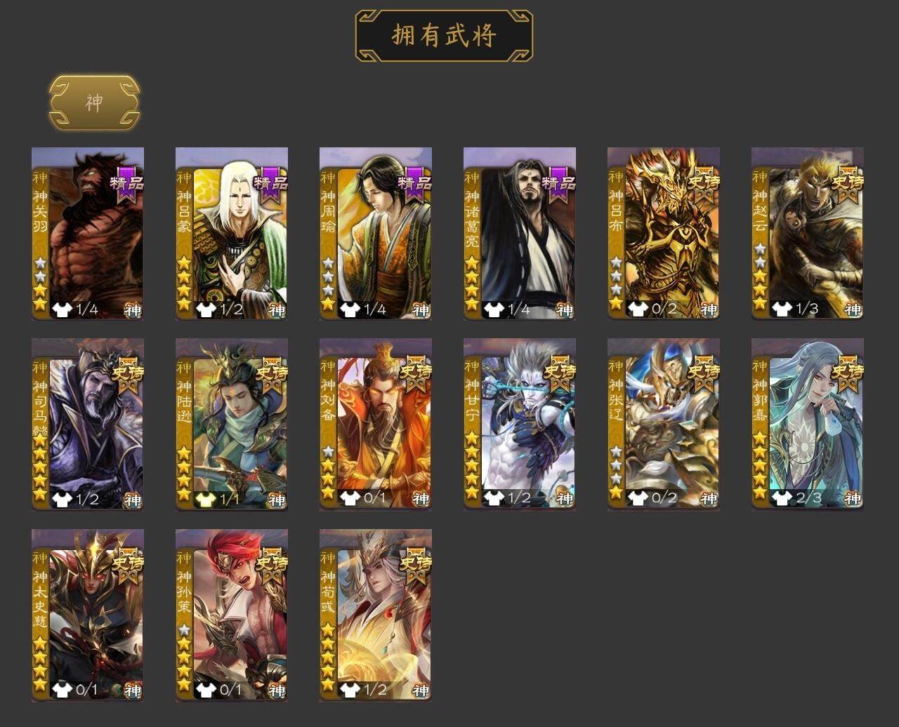 神吕布,神赵云,神司马懿,神陆逊,神刘备,神甘宁,神张辽,神郭嘉,神太史慈,神孙策,神荀彧,神关羽,神吕蒙,神周瑜,神诸葛亮,张昌蒲,王粲,杨修,羊徽瑜,文鸯,王元姬,王凌,马钧,界钟会,界于禁,界曹真,嵇康,郝昭,陈琳,曹婴,曹纯,戏志才,关索,谋刘备,马云騄,谋黄忠,谋夏侯氏